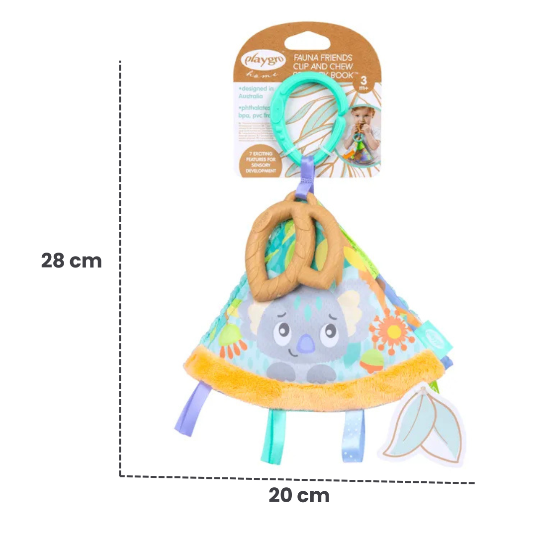 Presentamos el Libro Sensorial Clip and Chew Fauna Friends de Playgro, un encantador mordedor y juguete de desarrollo diseñado para estimular los sentidos de tu bebé.