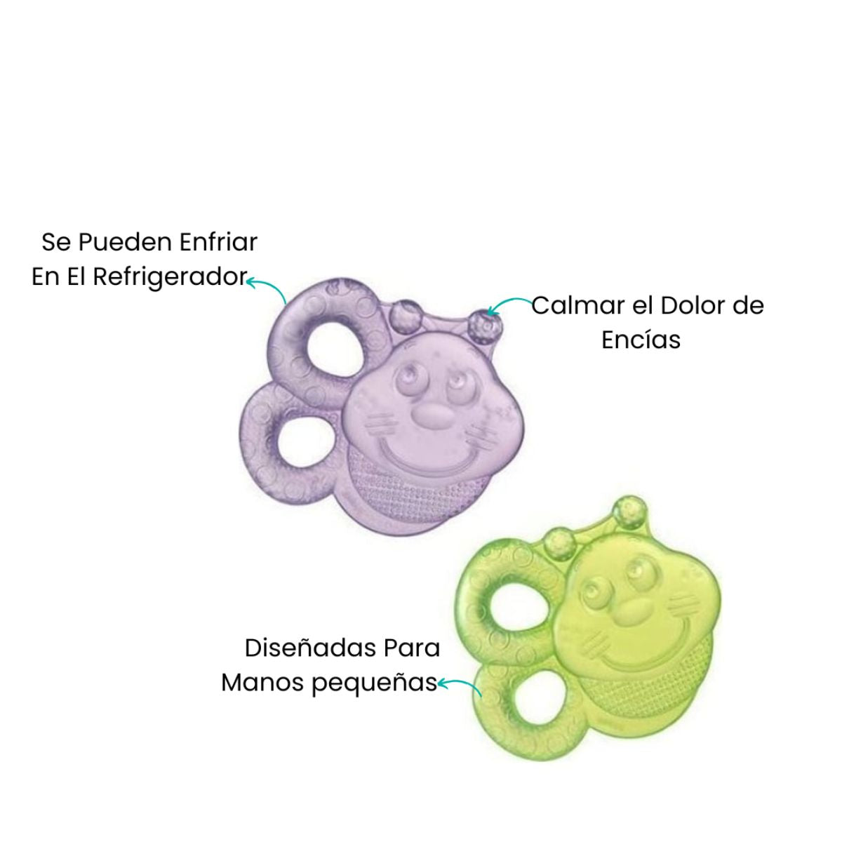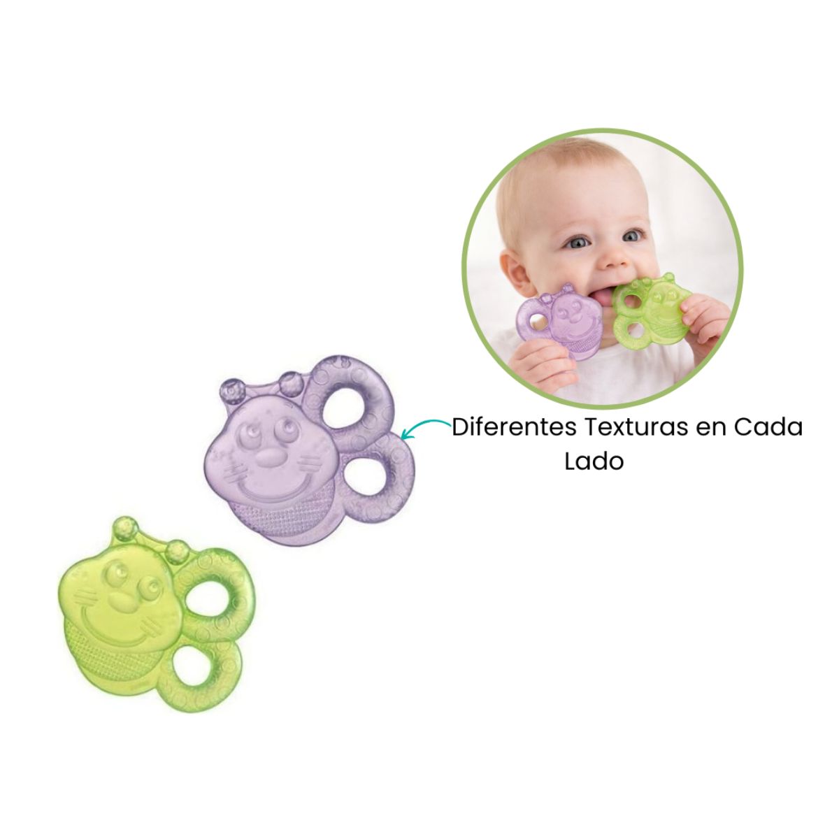 Los Masticadores con Agua, en vibrantes tonos de morado y verde, mantendrán a tu pequeño entretenido durante horas. Estas adorables abejas no solo son encantadoras para la vista, sino que también ofrecen una experiencia táctil única con su suave textura. Perfectos para la fase de masticación, estos compañeros coloridos proporcionarán horas de entretenimiento seguro y estimulante para tu bebé.
