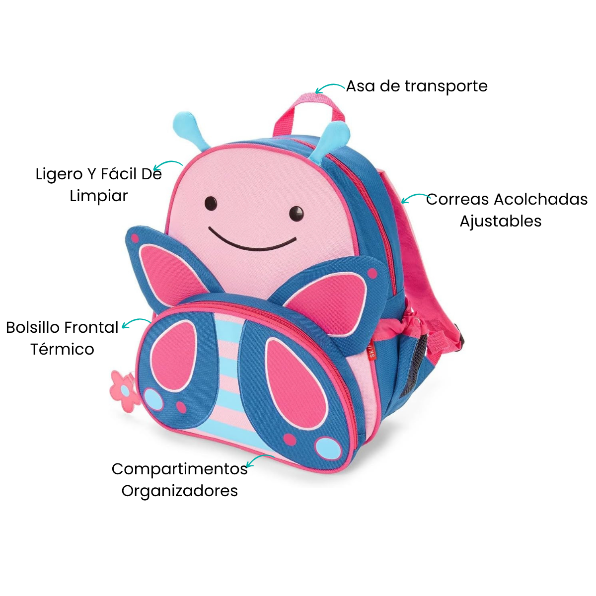 Esta práctica mochila cuenta con un amplio compartimento principal que permite guardar juguetes, ropa o útiles escolares, junto con un bolsillo frontal térmico perfecto para snacks o accesorios pequeños. Además, su bolsillo lateral de malla ajustable mantiene siempre a la mano la botella o jugo. Las correas acolchadas y ajustables aseguran un calce cómodo sobre los hombros, mientras que la etiqueta interior personalizable ayuda a identificarla fácilmente. Su diseño resistente y fácil de limpiar la convierte en una compañera perfecta para el uso diario.