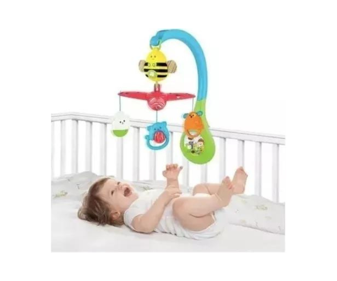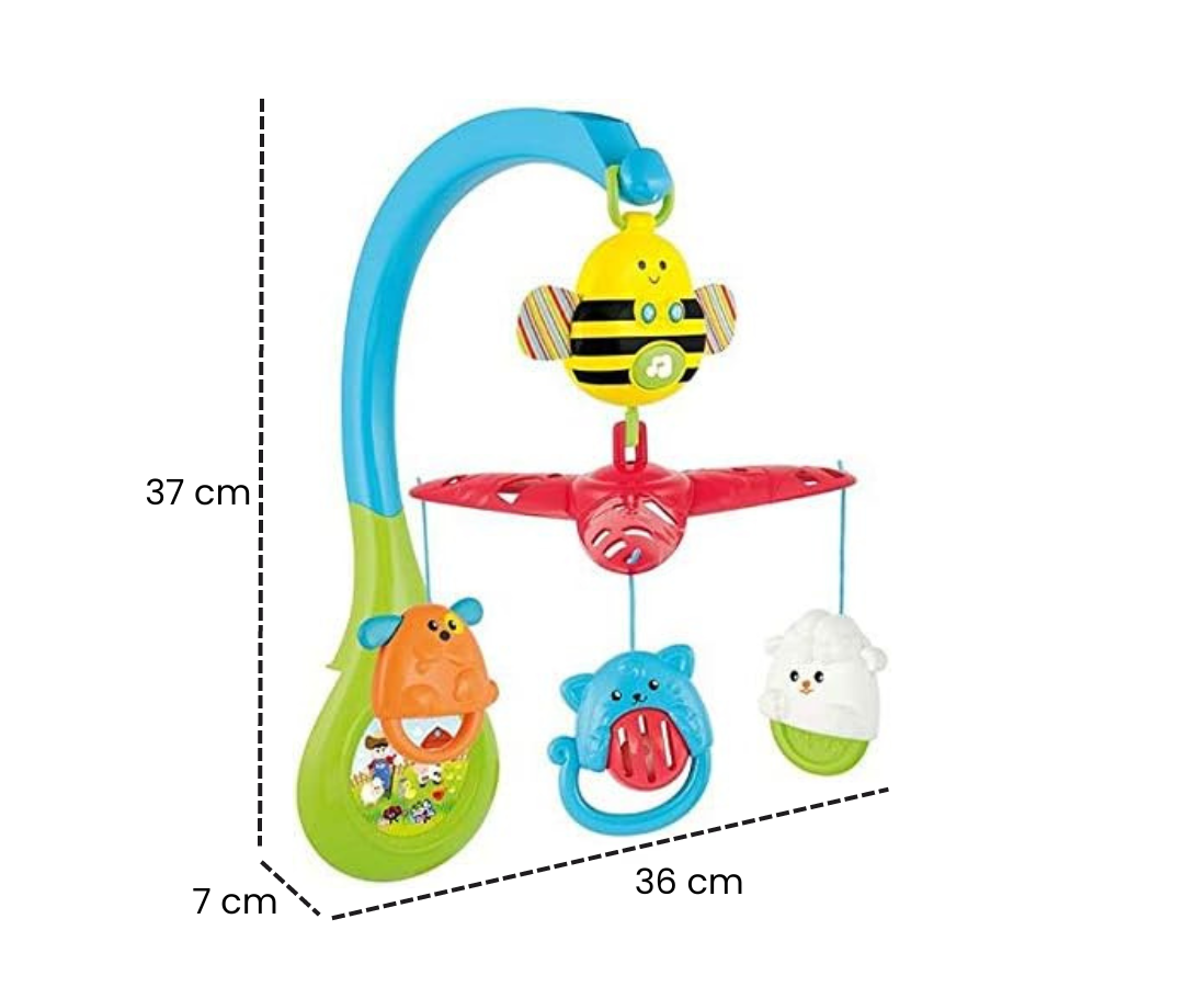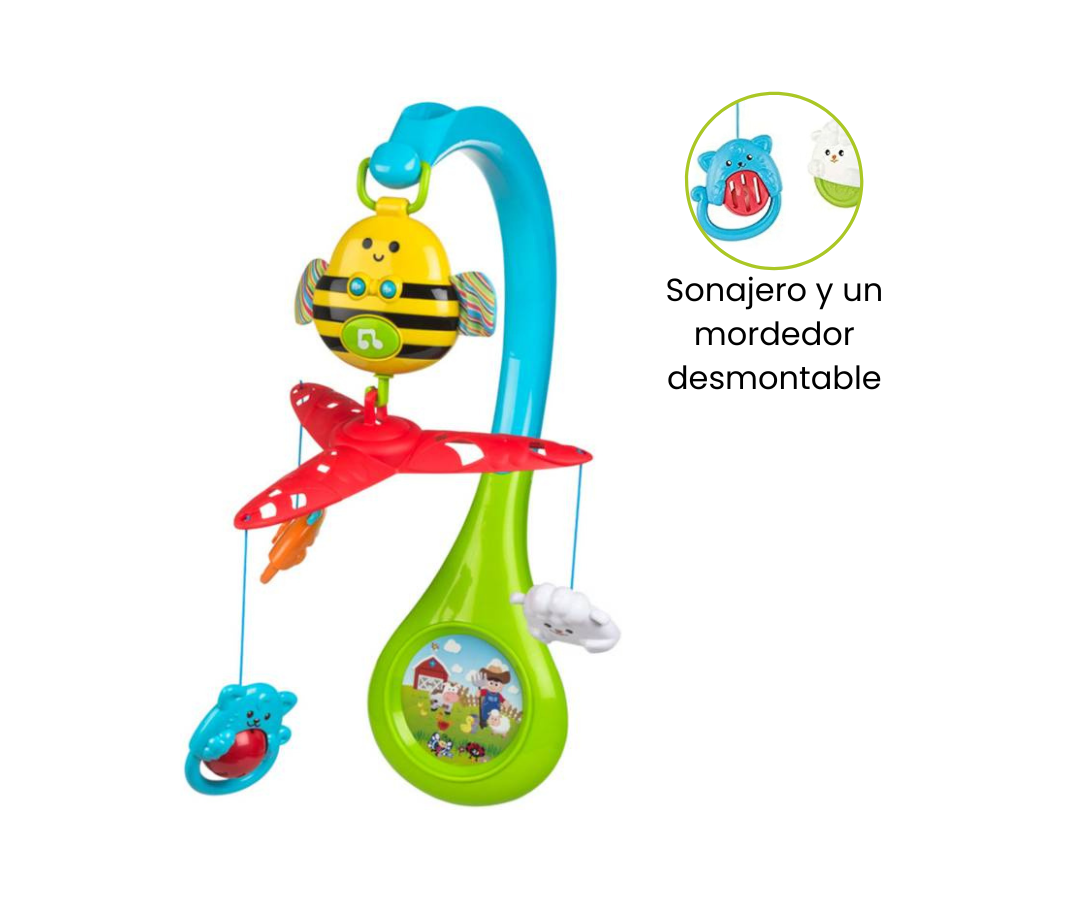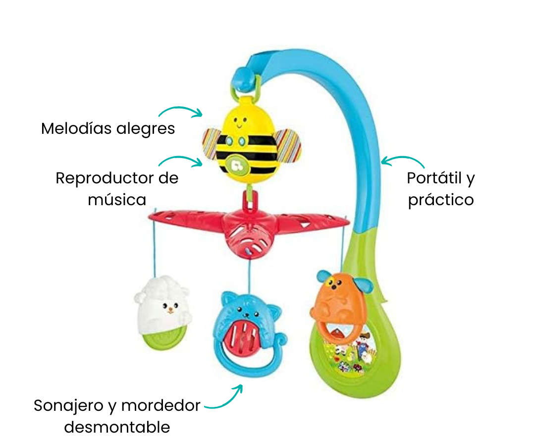 El móvil musical para cuna, esta equipado con una acción motorizada y un adorable reproductor de música en forma de abeja que puede llevarse consigo, este móvil no solo ofrece melodías alegres sino también entretenimiento interactivo.