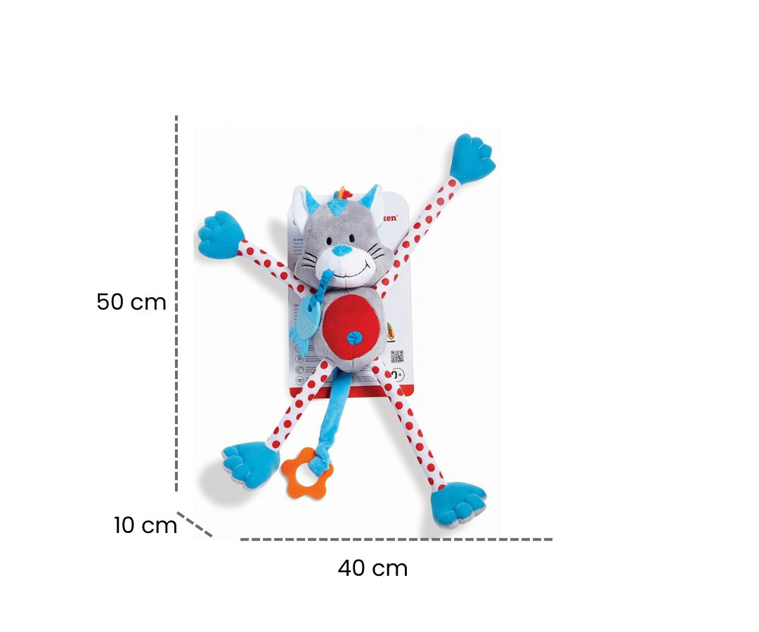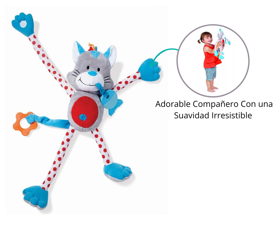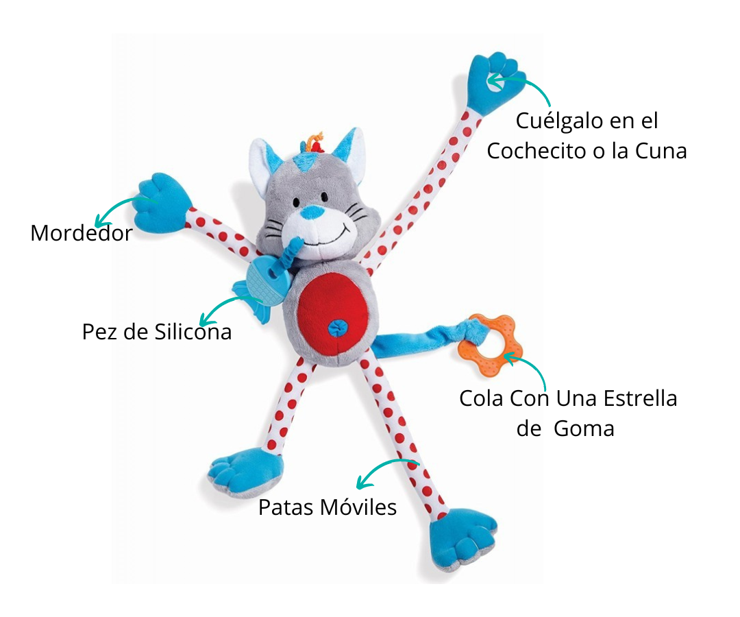 Este juguete encantador fusiona diversión y funcionalidad: es un gatito blando, un mordedor y un juguete sensorial, ¡todo en uno! El gatito esconde sorpresas, siendo la 'pata' la más divertida. Sus patas son móviles y se pueden estirar libremente, creando una experiencia única. Cada pata o mango es más corto en un lado que en el otro, generando diversión y asombro en cada movimiento.