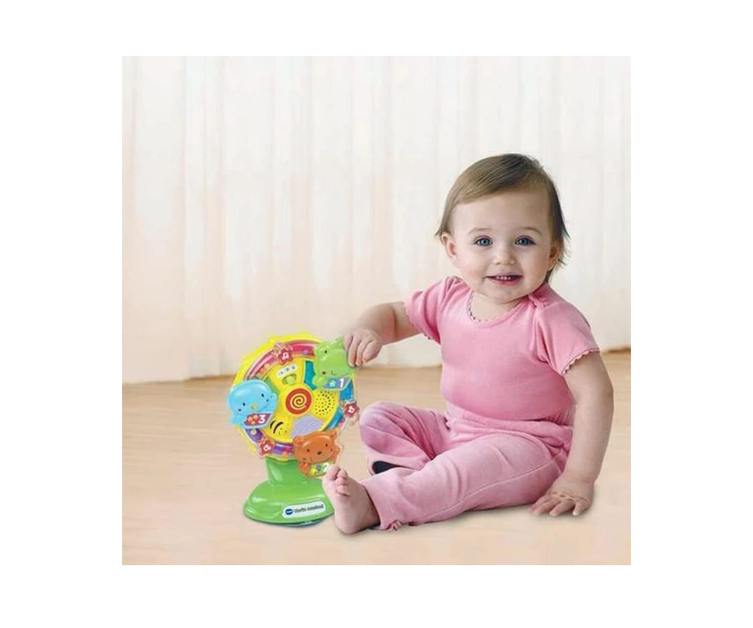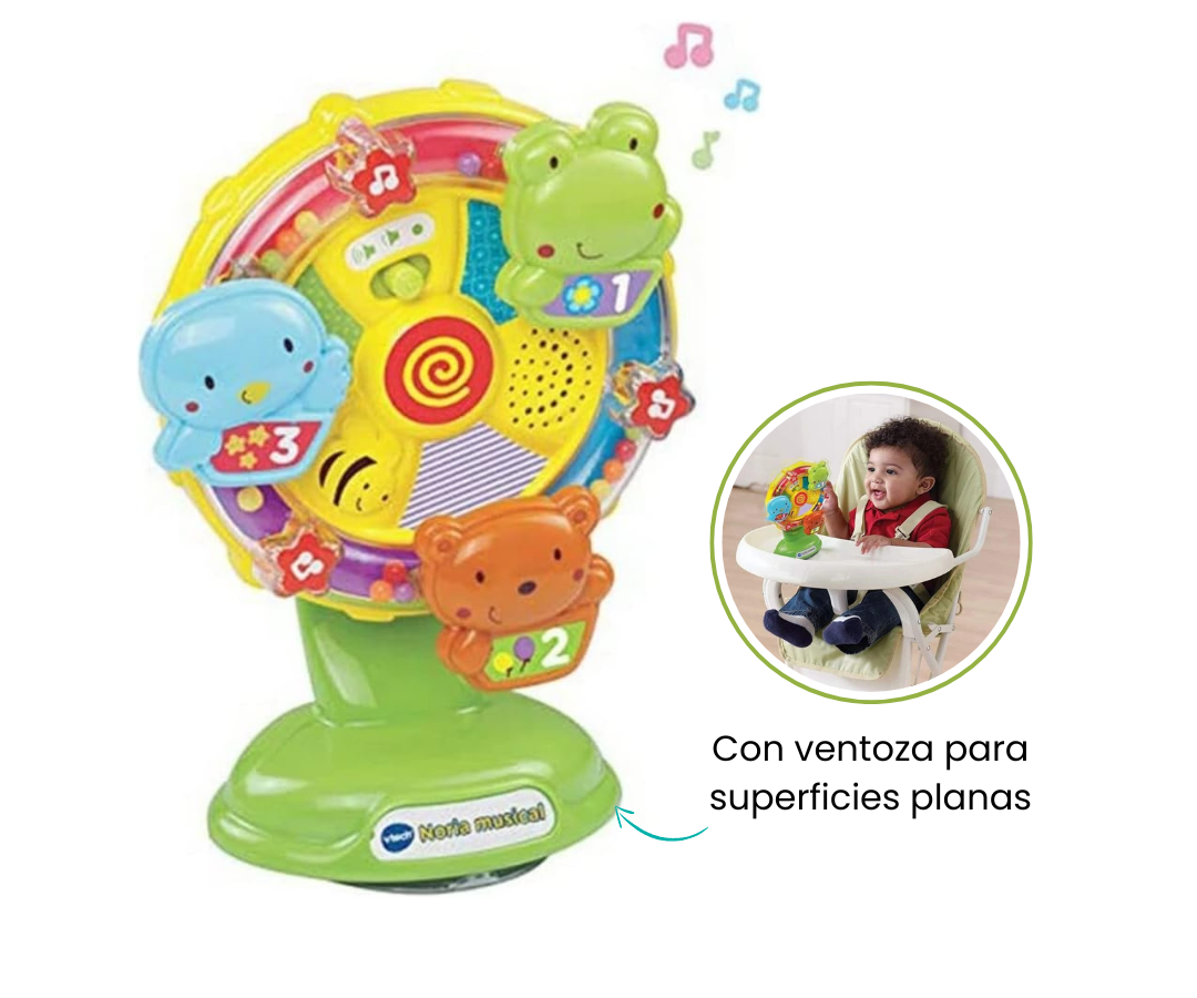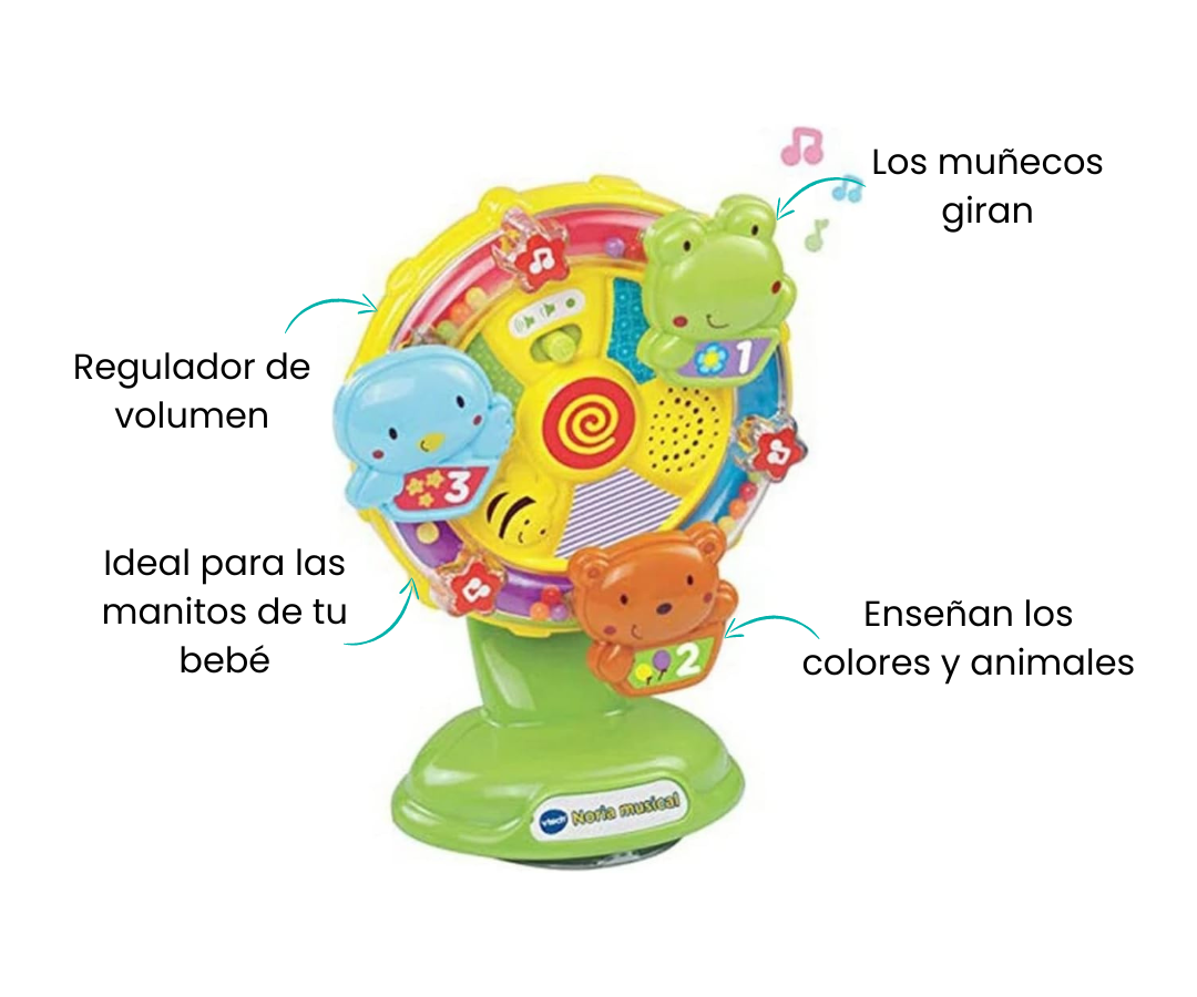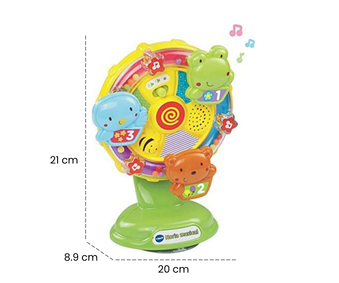 Cuando el bebé gira la Noria Musical, se desata una sinfonía de sonidos y melodías encantadoras que llenan el entorno de magia. Cada giro es una aventura musical que estimula la curiosidad y la exploración.