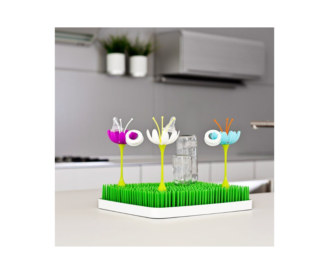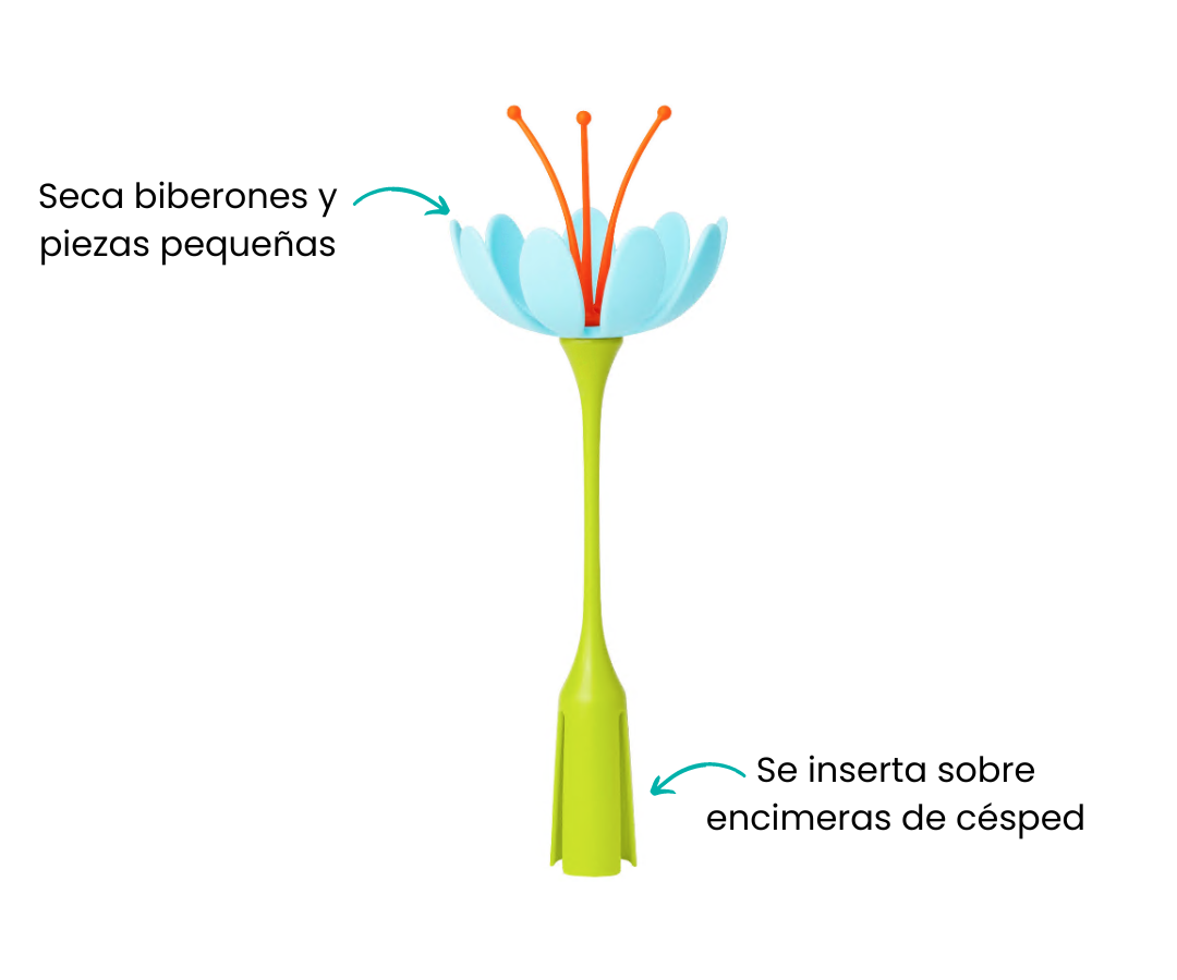 El sostén para biberones y piezas pequeñas del vasito, esta diseñado para ser utilizado en conjunto con los accesorios para secar encimeras de césped, ofreciendo una solución completa para el secado eficiente de artículos de cuidado infantil.