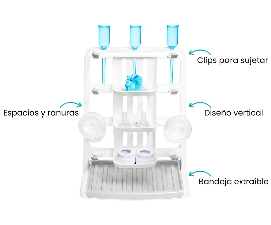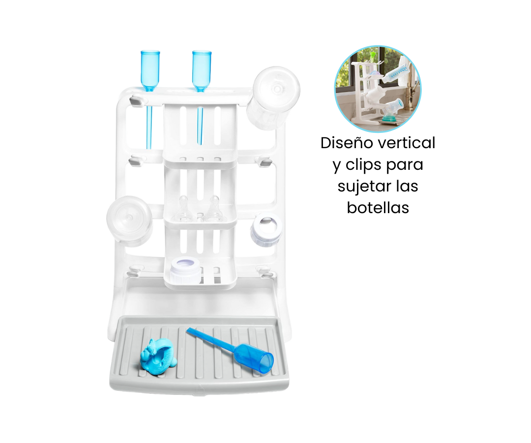 Cuenta con un diseño vertical y clips para sujetar las botellas en el ángulo correcto para el secado. No necesitas varias rejillas de secado, este tiene espacios y ranuras para mantener todo en un solo lugar, además de una bandeja de goteo que se extrae para obtener más espacio cuando lo necesitas.