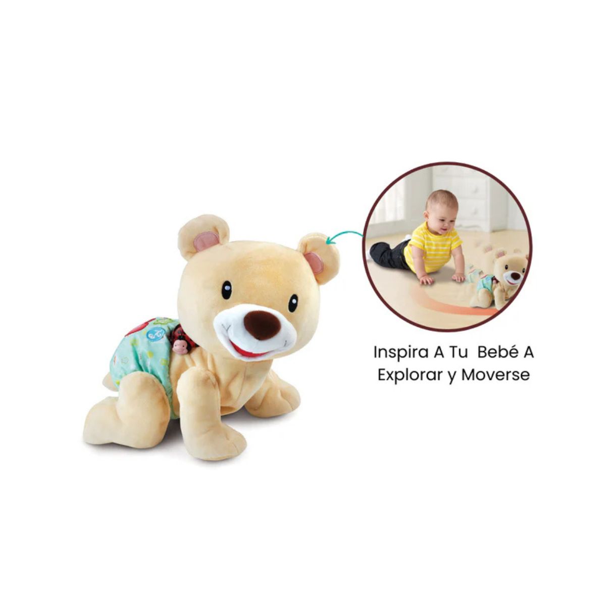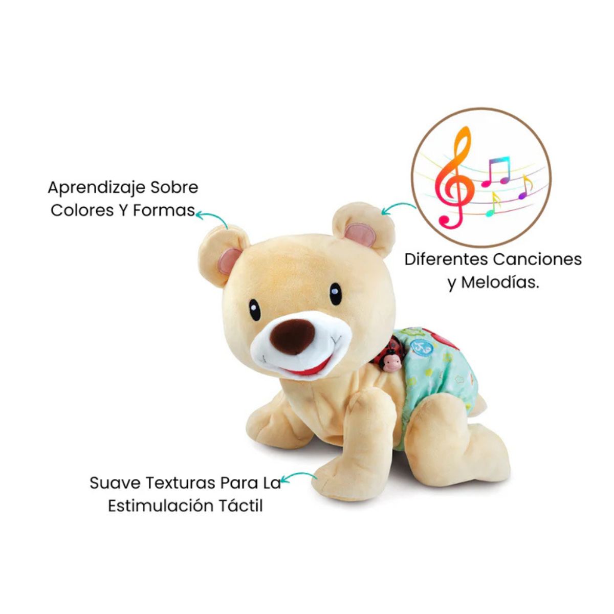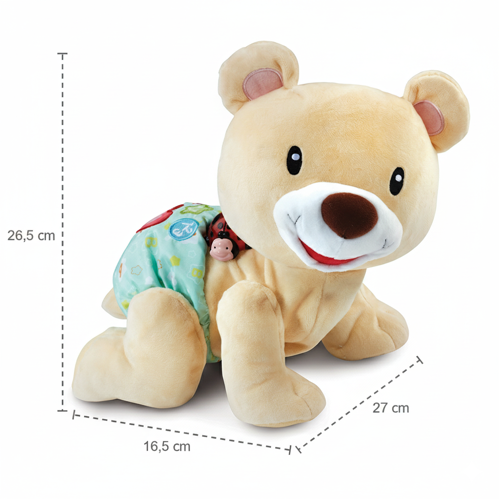 El osito interactivo acompaña al bebé en sus primeros descubrimientos con ternura, música y aprendizaje. Con su dulce voz y movimientos realistas, anima al pequeño a gatear, moverse y cantar, fortaleciendo la coordinación y el desarrollo motor. Su textura suave y su simpática expresión lo convierten en un amigo inseparable en casa o durante los momentos de juego..