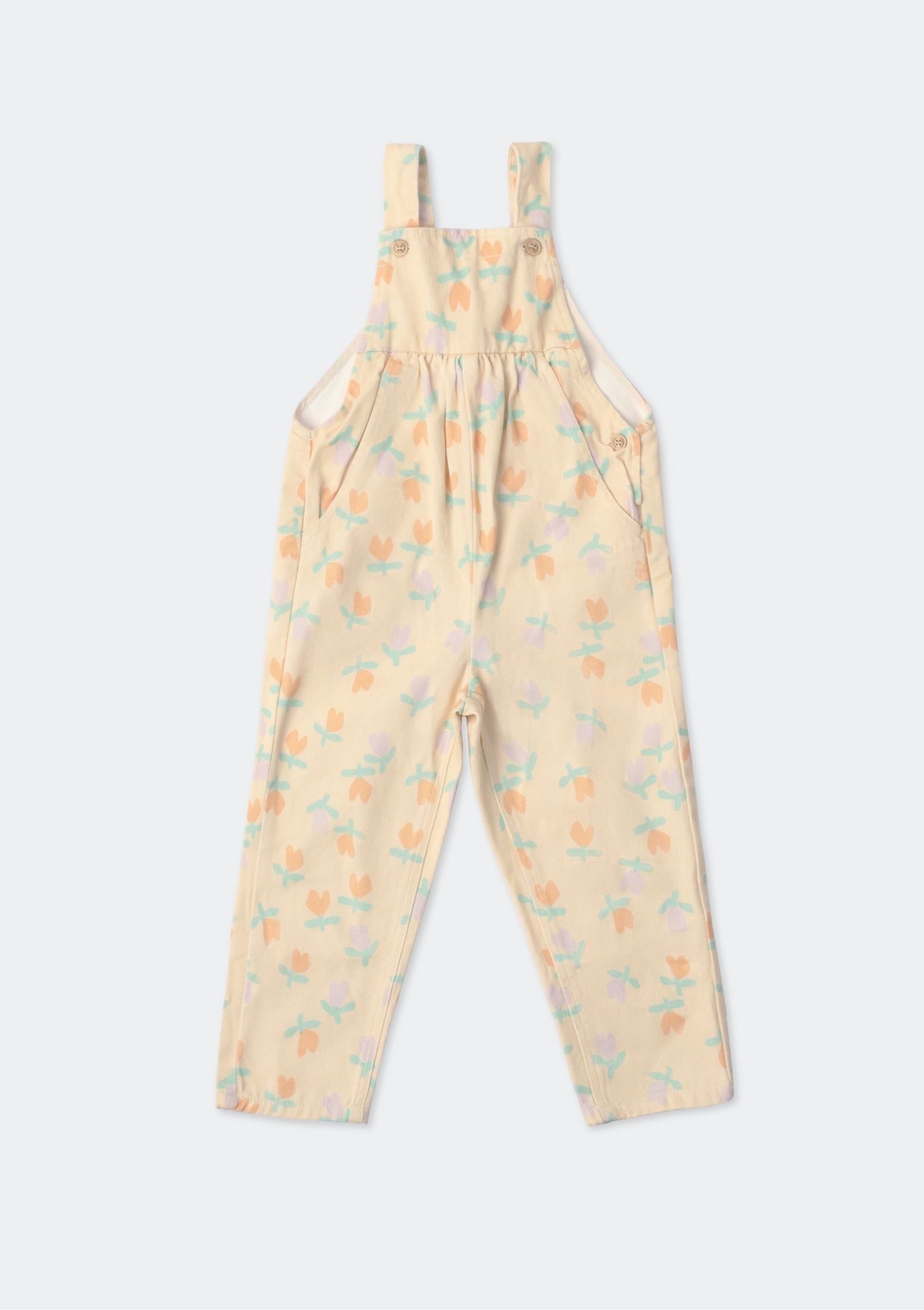 Lleva tirantes medianos con botones y ojales para un mejor ajuste. Detalle de corte frontal con frunces que forman bolsillos funcionales y estampado en toda la pieza.