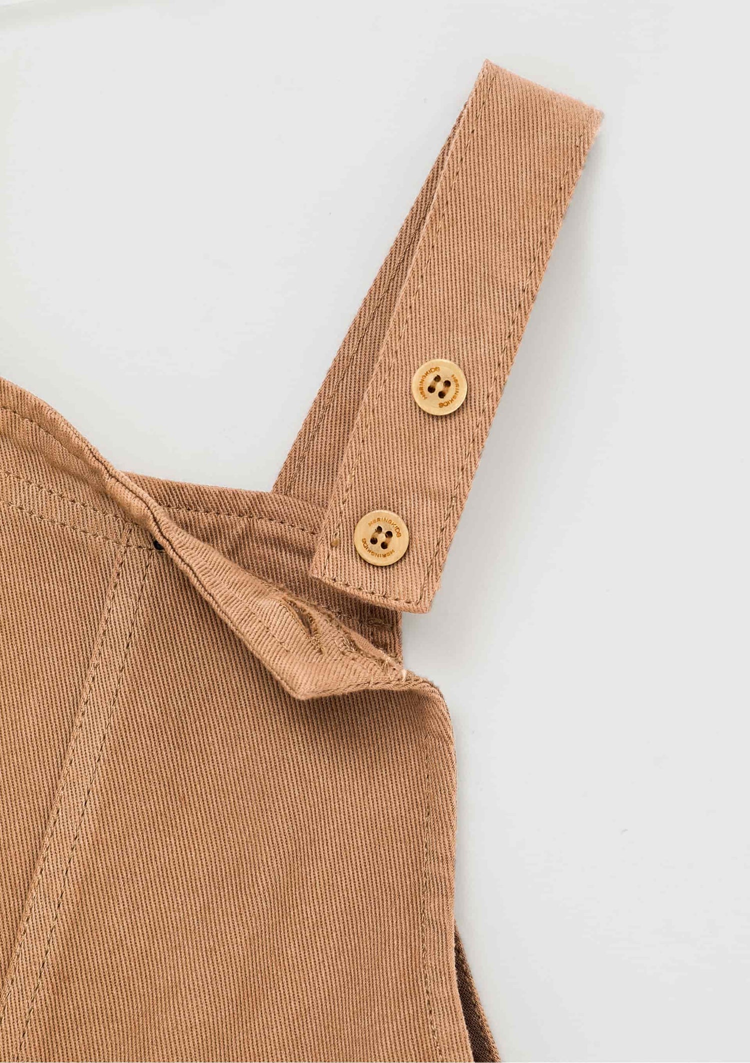 Lleva tirantes medianos con botones y ojales para un mejor ajuste. Detalle de corte frontal con frunces que forman bolsillos funcionales y estampado en toda la pieza.