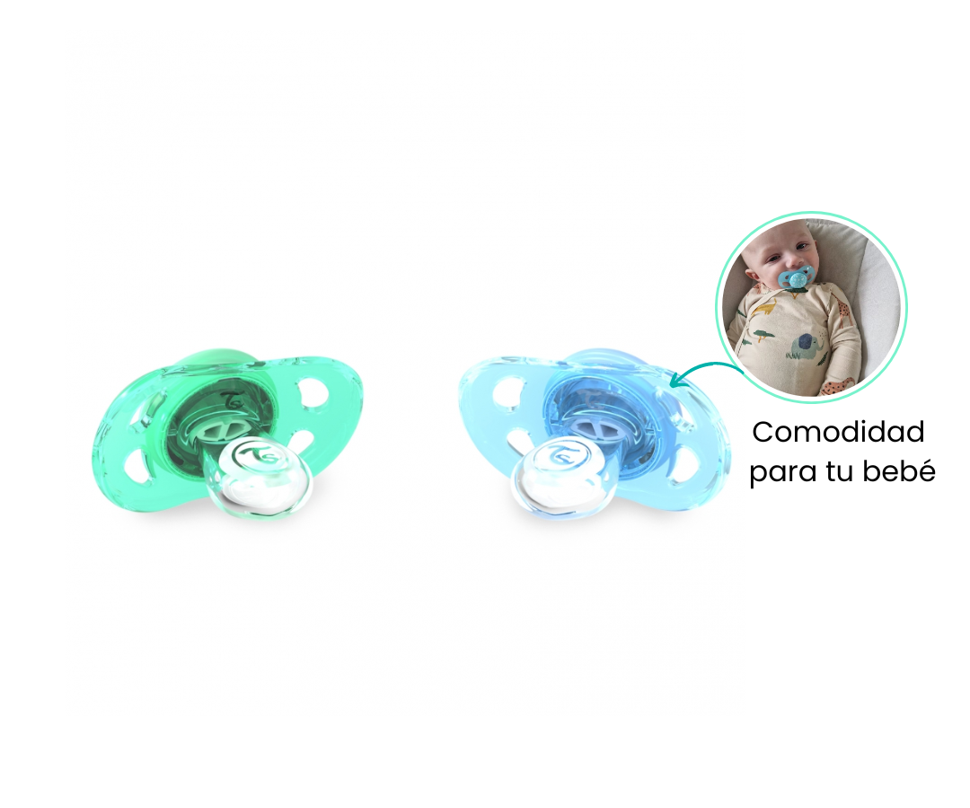 Los chupetes están diseñados con una tetina fabricada con la silicona más suave, garantizando la máxima comodidad para tu bebé. Además, cuentan con orificios de ventilación que evitan la irritación de la piel, proporcionando una sensación agradable en todo momento. Su forma ortodóntica está pensada para el correcto crecimiento de los dientes y la mandíbula, brindando un apoyo óptimo para el desarrollo bucal de tu pequeño.