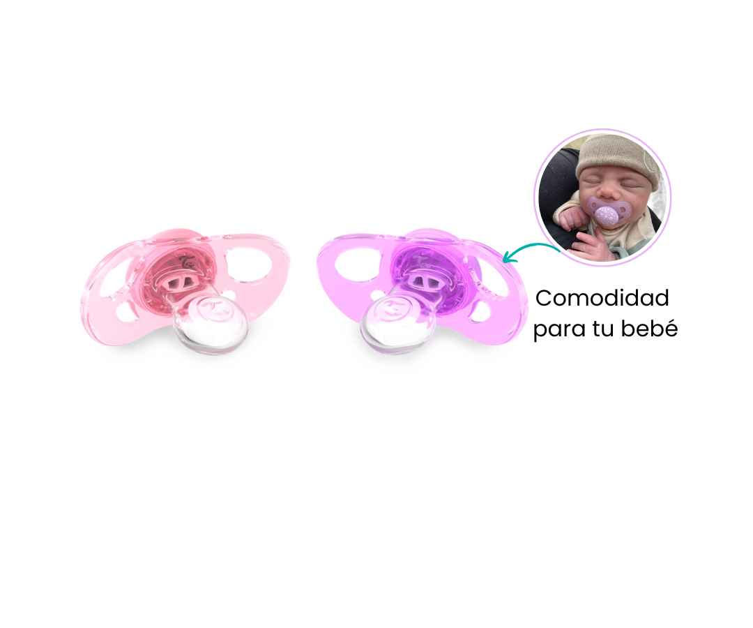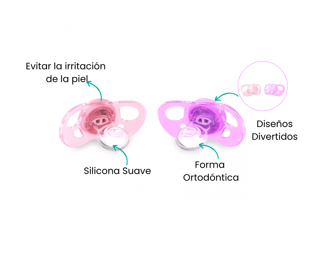 Los chupetes están diseñados con una tetina fabricada con la silicona más suave, garantizando la máxima comodidad para tu bebé. Además, cuentan con orificios de ventilación que evitan la irritación de la piel, proporcionando una sensación agradable en todo momento. Su forma ortodóntica está pensada para el correcto crecimiento de los dientes y la mandíbula, brindando un apoyo óptimo para el desarrollo bucal de tu pequeño.