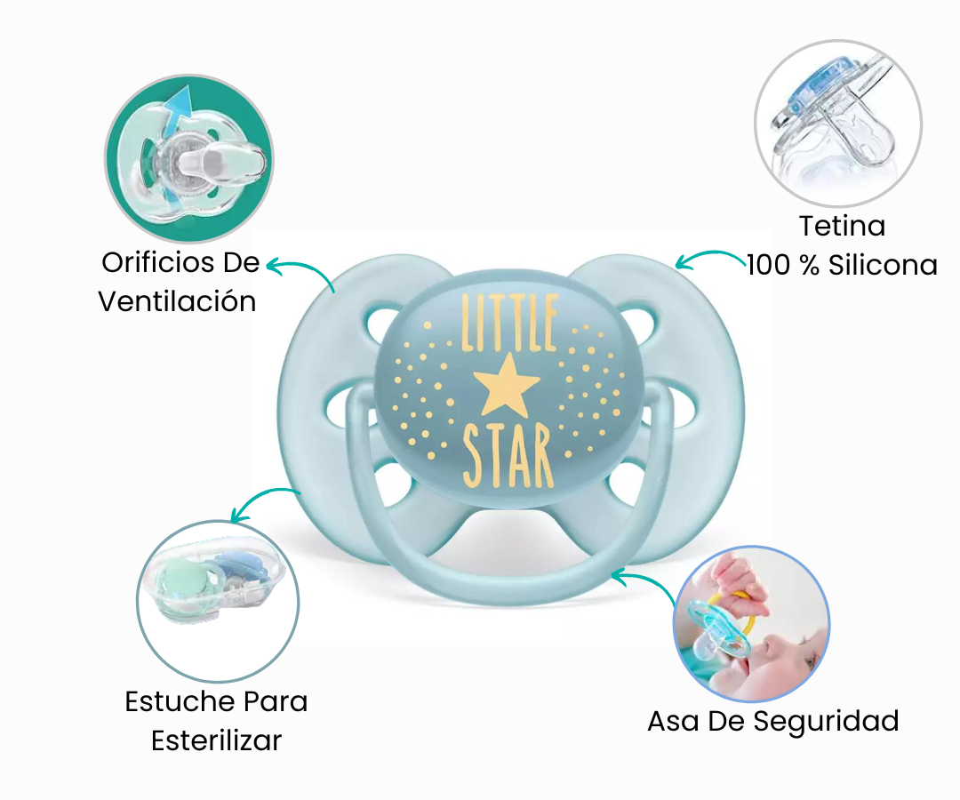 El chupete Ultra Soft es un producto diseñado para proporcionar comodidad y tranquilidad a los recién nacidos hasta los 6 meses. Su diseño tiene un escudo especialmente curvado que se ajusta perfectamente a la forma natural de la carita del bebé. Esta fabricado con silicona de grado médico, lo que garantiza que es seguro y libre de BPA. Además, es esterilizable, lo que facilita su higiene y cuidado, asegurando un ambiente limpio y saludable para el pequeño.
