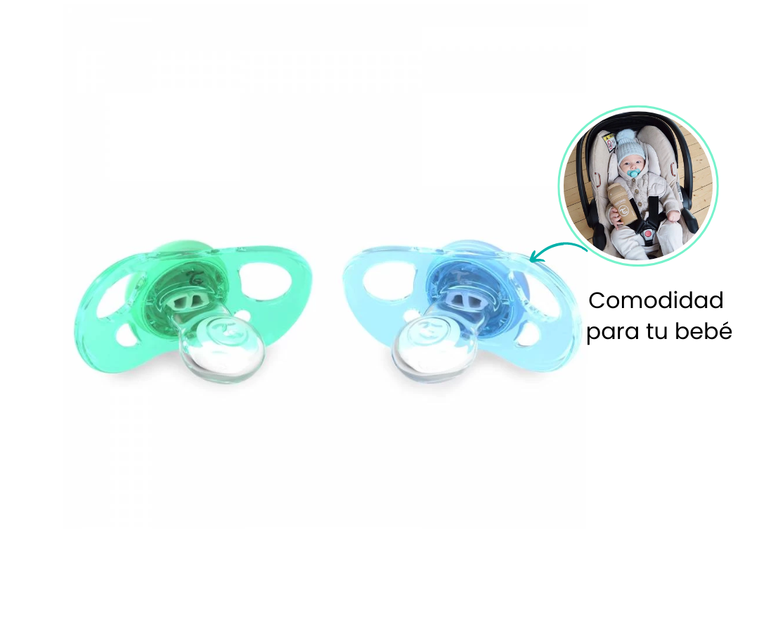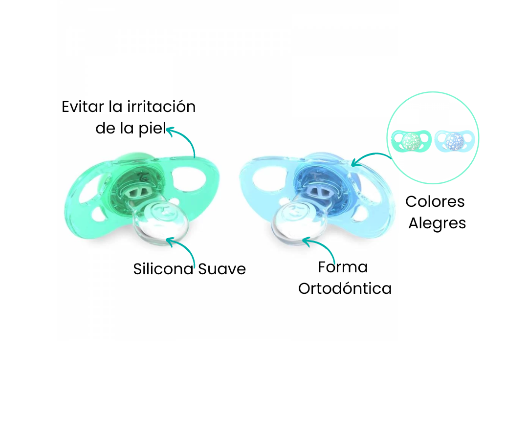 Los chupetes están diseñados con una tetina fabricada con la silicona más suave, garantizando la máxima comodidad para tu bebé. Además, cuentan con orificios de ventilación que evitan la irritación de la piel, proporcionando una sensación agradable en todo momento. Su forma ortodóntica está pensada para el correcto crecimiento de los dientes y la mandíbula, brindando un apoyo óptimo para el desarrollo bucal de tu pequeño.