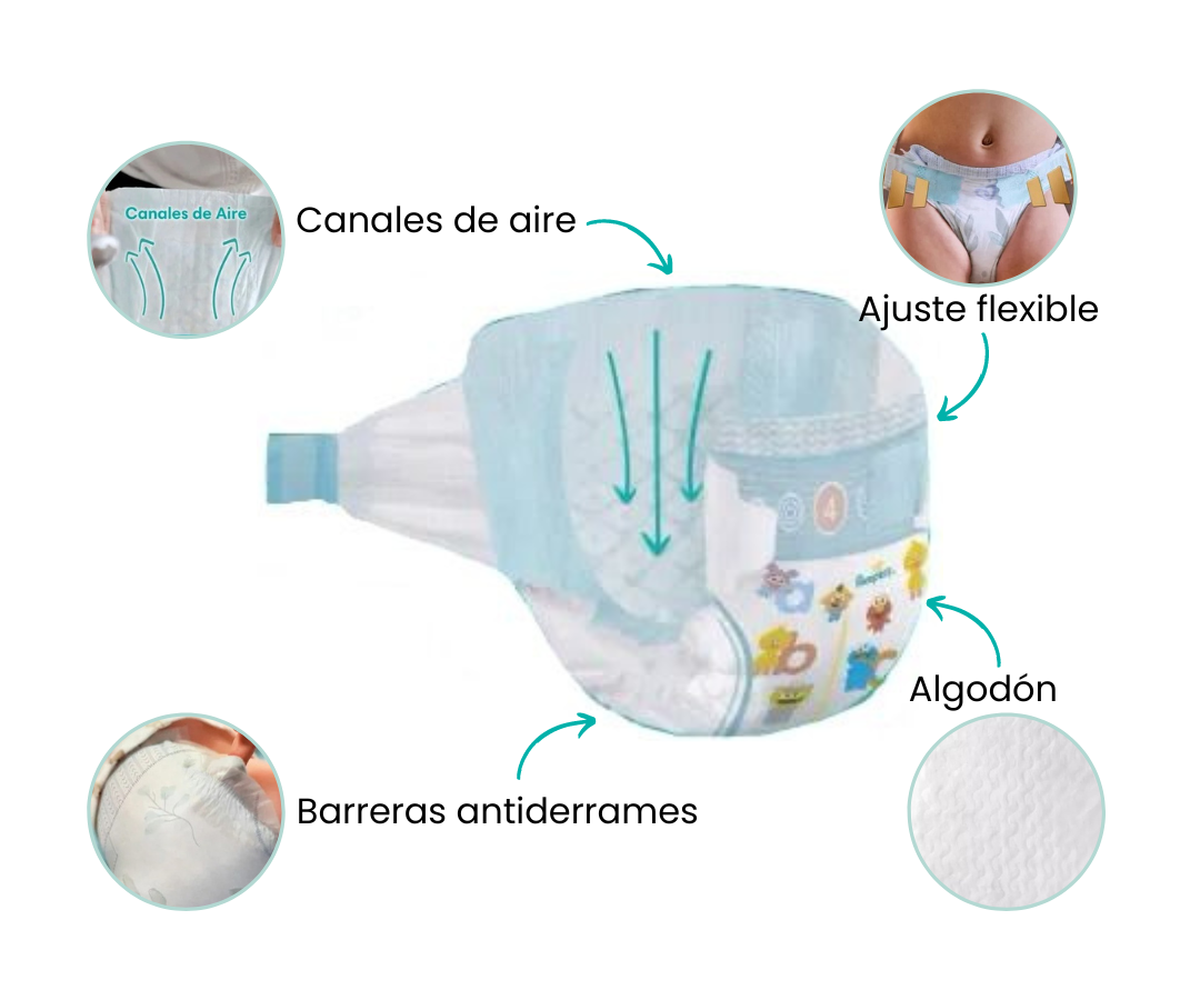 Estos pañales están diseñados para mantener a tu bebé hasta tres veces más seco gracias a sus exclusivos canales de aire, brindando hasta 12 horas de sequedad durante la noche. Confeccionados con un material suave como el algodón y tres capas de protección en su interior, ofrecen una comodidad excepcional.