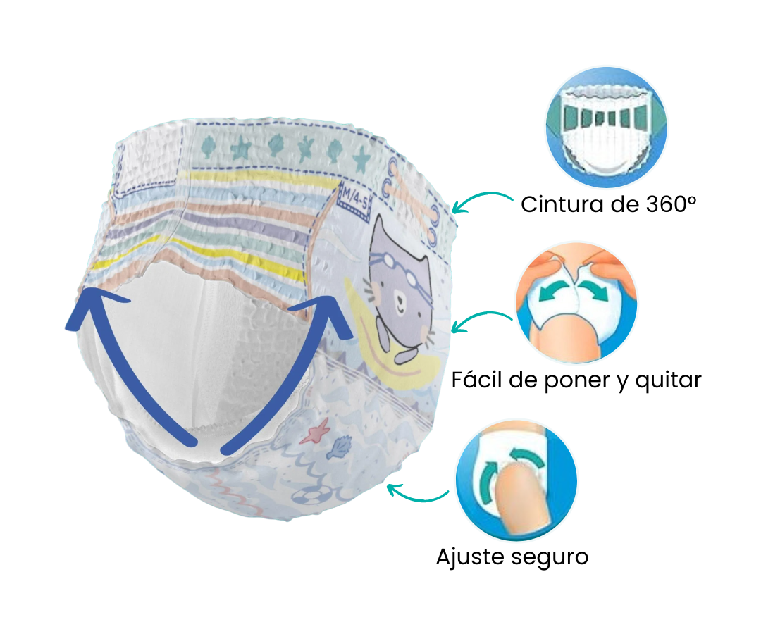 Están diseñados con una cintura elástica versátil de 360° que se ajusta como un traje de baño y se puede poner y quitar fácilmente, incluso cuando está mojado. Además, se pueden quitar facilmente para una eliminación rápida con menos desorden. Los Pampers Splashers hacn que un día en la piscina sea aún más divertido.