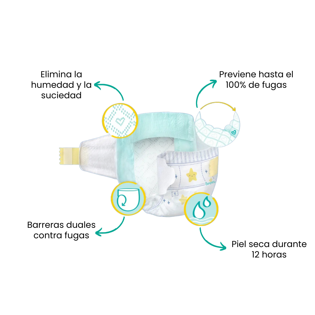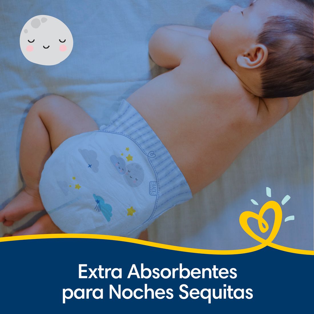 Los pañales nocturnos de Pampers ofrecen una protección excepcional manteniendo la piel de la bebé seca toda la noche con un 50 % más de zonas absorbentes. Los pañales Swaddlers Overnight con barrera de soplado previenen fugas, incluso reventones, asegurando noches hasta 100 % a prueba de fugas. Con menos fugas, tu bebé disfrutará de un sueño más reparador. Nuestros mejores pañales para toda la noche cuentan con un forro que absorbe la humedad, ayudando a mantener la piel del bebé saludable durante hasta 12 horas.