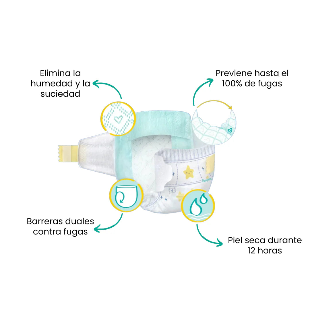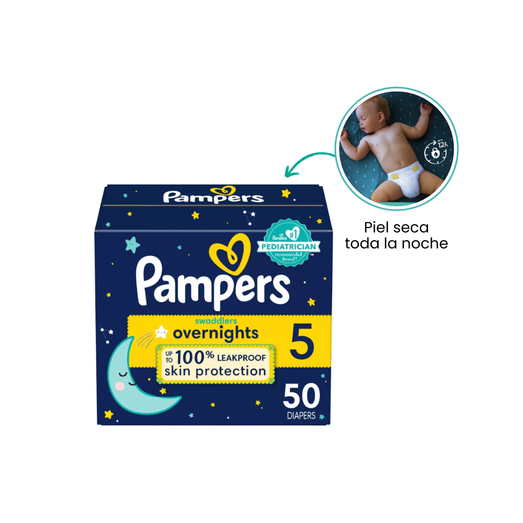 Los pañales nocturnos de Pampers ofrecen una protección excepcional manteniendo la piel de la bebé seca toda la noche con un 50 % más de zonas absorbentes. Los pañales Swaddlers Overnight con barrera de soplado previenen fugas, incluso reventones, asegurando noches hasta 100 % a prueba de fugas. Con menos fugas, tu bebé disfrutará de un sueño más reparador. Nuestros mejores pañales para toda la noche cuentan con un forro que absorbe la humedad, ayudando a mantener la piel del bebé saludable durante hasta 12 horas.