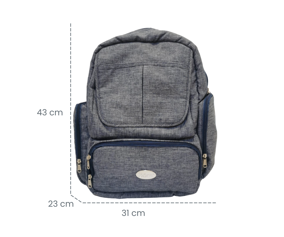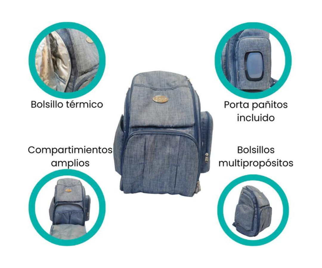 Mochila pañalera con múltiples y prácticos bolsillos para guardar lo esencial, incluye cambiador y bolsillo para guardad biberones.