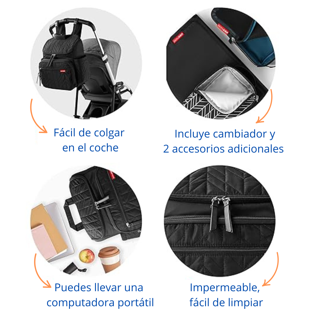 Ofrece facilidad de manos libres y cubos de embalaje especiales para el equipo del bebé. El espacioso interior se adapta a todo, desde aperitivos hasta atuendos de repuesto y la apertura extra ancha hace que sea fácil encontrar elementos esenciales en un apuro
