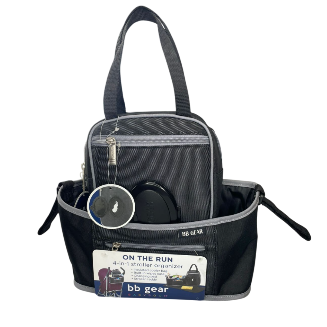 Pañalera 4 en 1 con adaptadores para colocarla en el coche. Incluye un estuche de pañitos húmedos, bolsillos que mantienen frio los biberones, espacio amplio con varios bolsillos y un cambiador.