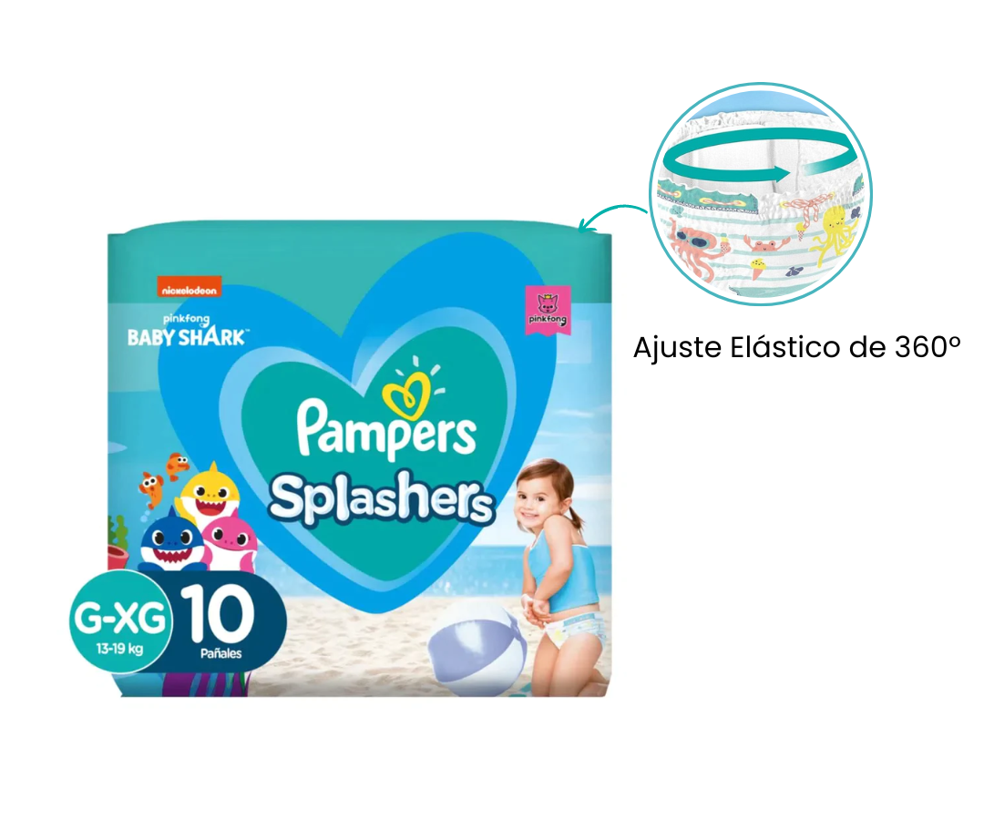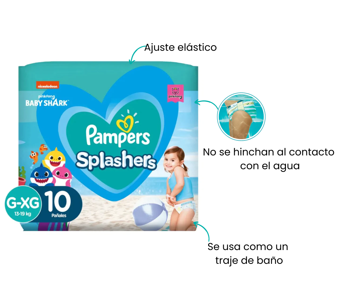 Los pañales desechables para piscina Pampers Splashers están diseñados para divertirse en la piscina, la playa y el parque, ofreciendo comodidad y libertad de movimiento. No se hinchan en el agua como los pañales normales, garantizando un ajuste perfecto incluso cuando están mojados.