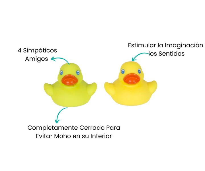 Este encantador set incluye no solo uno, ni dos, ni tres sino cuatro adorables patitos diseñados pensando en la diversión y el desarrollo de tu pequeño!. Con colores vibrantes que capturan la atención y formas perfectamente adecuadas para las manitas del bebé, estos patitos se convierten en los compañeros ideales para la hora del baño.
