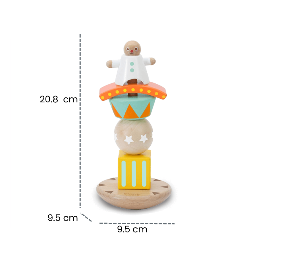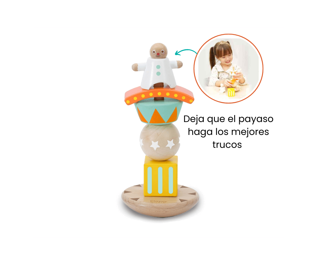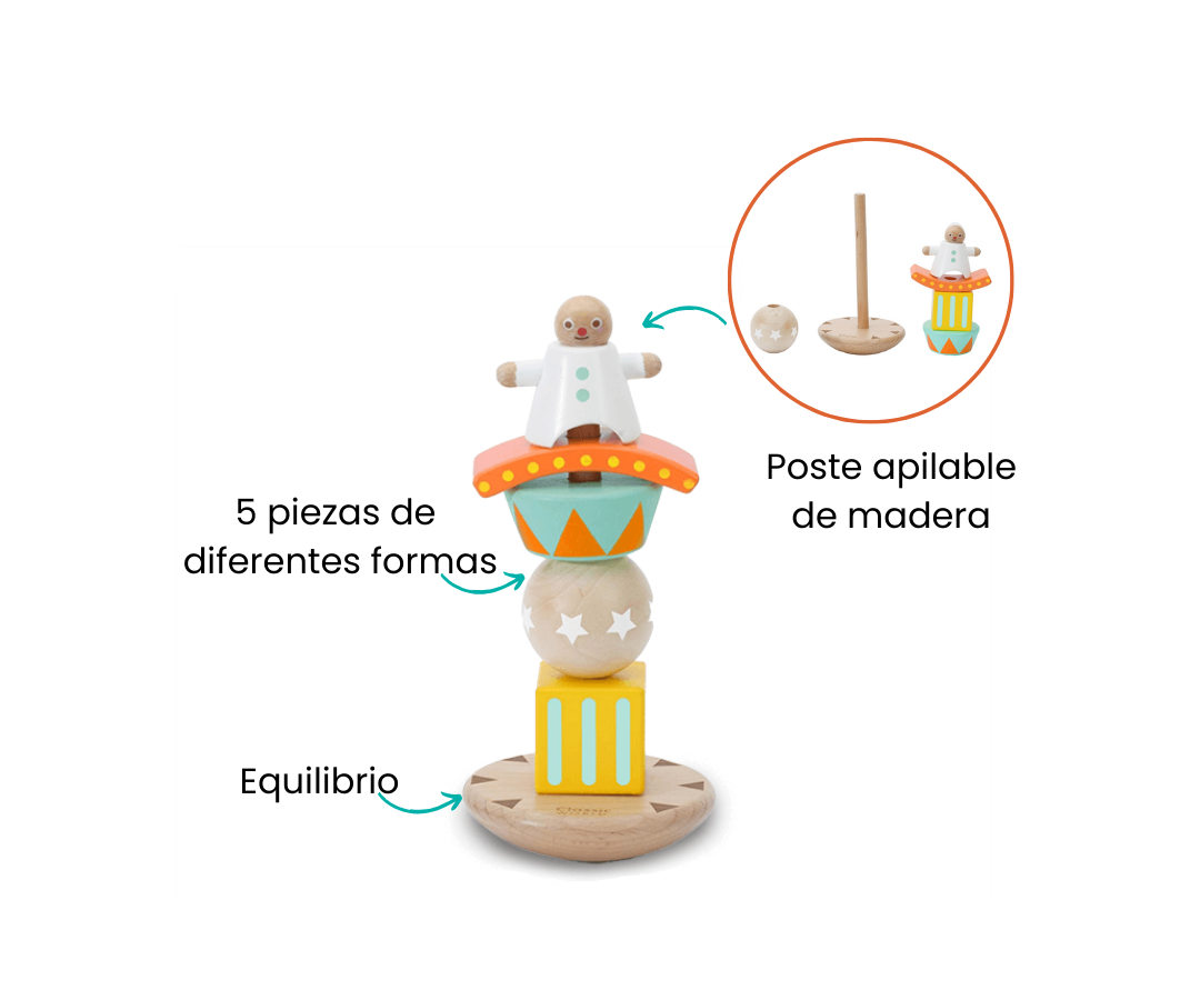 Este juguete de madera es bonito ya que con cinco elementos que se apilan en un poste, pero ¡cuidado! La base es curva, lo que requiere habilidad para mantenerlo en equilibrio. Además, las piezas se pueden usar por separado, ofreciendo diversas formas de juego y apilado. Es un juguete versátil que promueve la destreza y la creatividad.