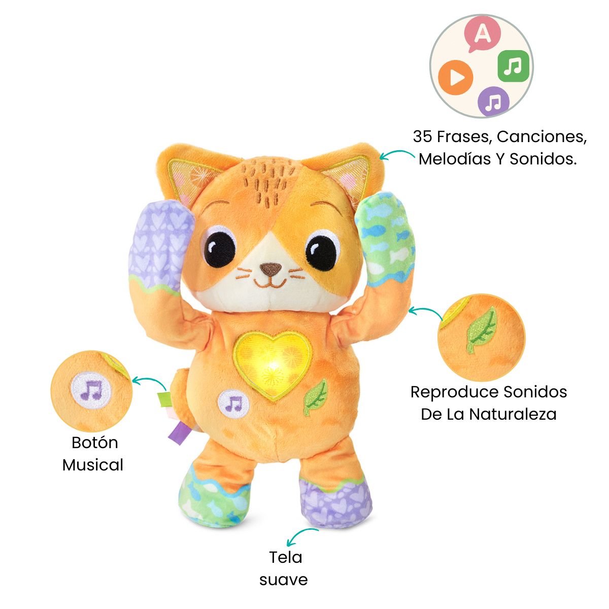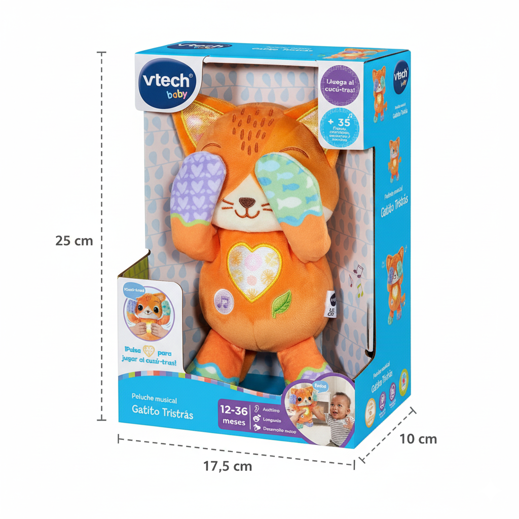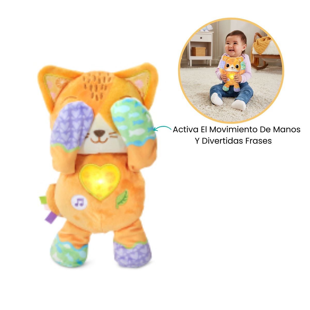 Este peluche interactivo para bebés +12 meses invita a jugar y aprender con el clásico juego del cucú-tras. Suave, seguro y lleno de color, este simpático gatito se convertirá en el compañero ideal para acompañar los primeros descubrimientos del bebé. Con cada movimiento y melodía, fomenta la risa, la curiosidad y el vínculo afectivo entre padres e hijos.