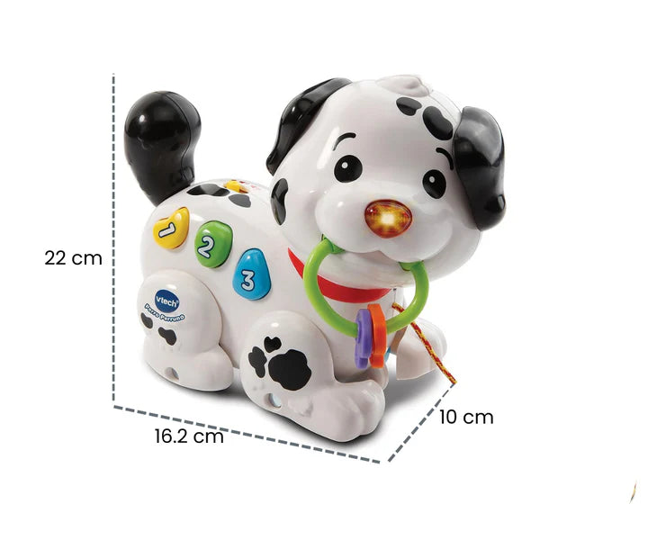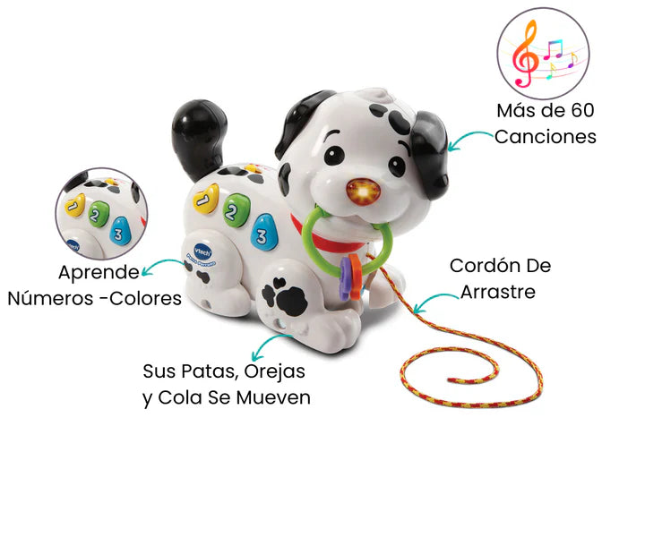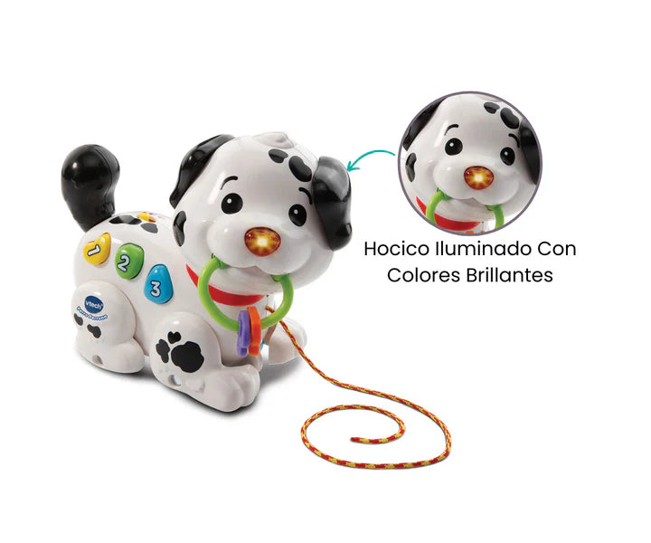 Cuando el niño tira suavemente de la cuerda, el adorable perrito dálmata cobra vida. Sus patitas se mueven con entusiasmo, y a medida que avanza, despierta alegres frases que llenan el aire de risas y emoción. ¡Pero eso no es todo! El hocico del perrito se ilumina con colores brillantes, creando un espectáculo visual que captura la imaginación.