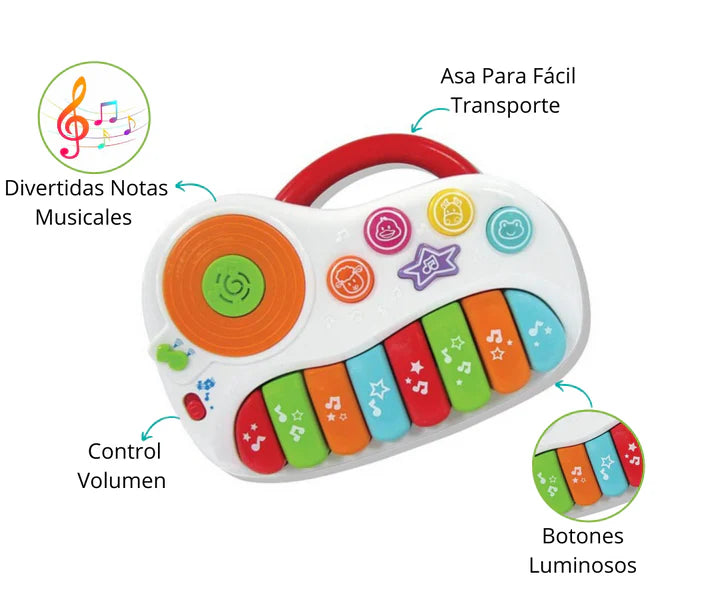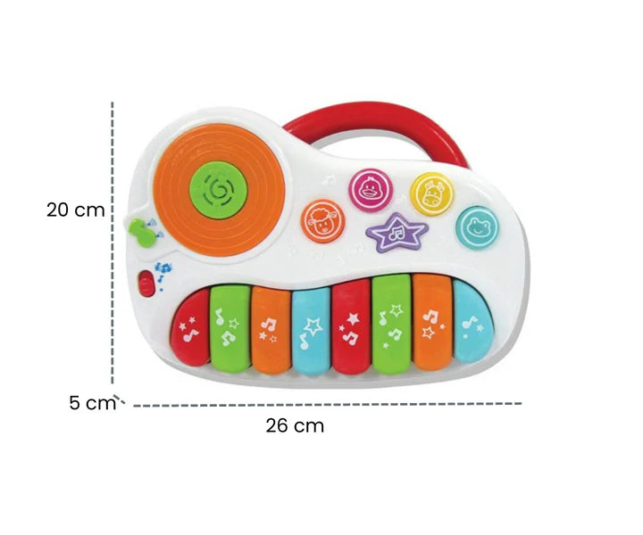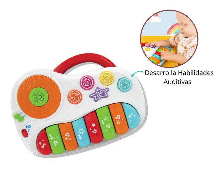 Este juguete educativo musical es ideal para todos los niños pequeños. Con ocho botones de sonidos de la gama y cuatro botones de función con imágenes de animales, el piano les permite crear sus primeras melodías. Además de mejorar las habilidades motoras y sensoriales, estimula la actividad cognitiva y educa los sentidos durante el juego.