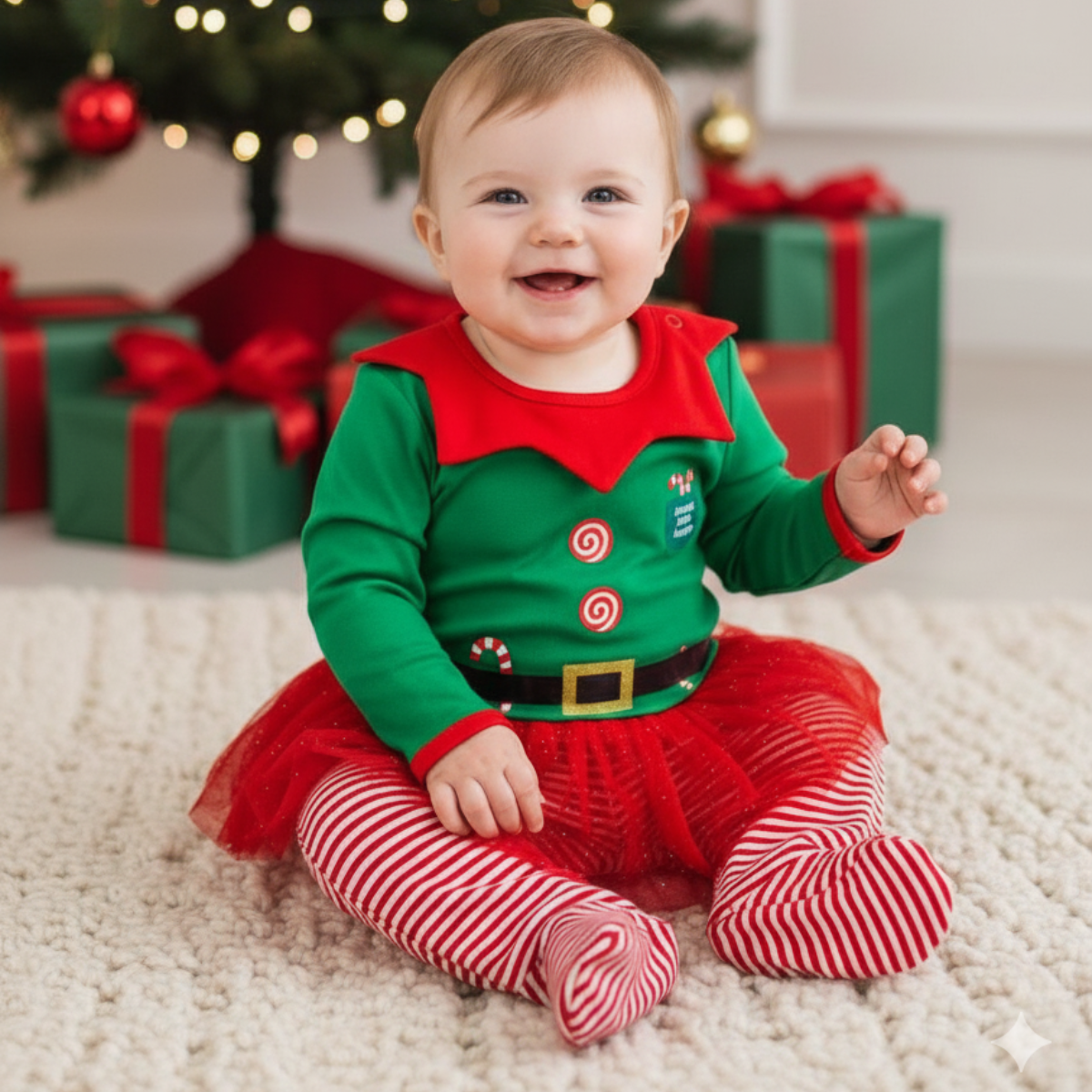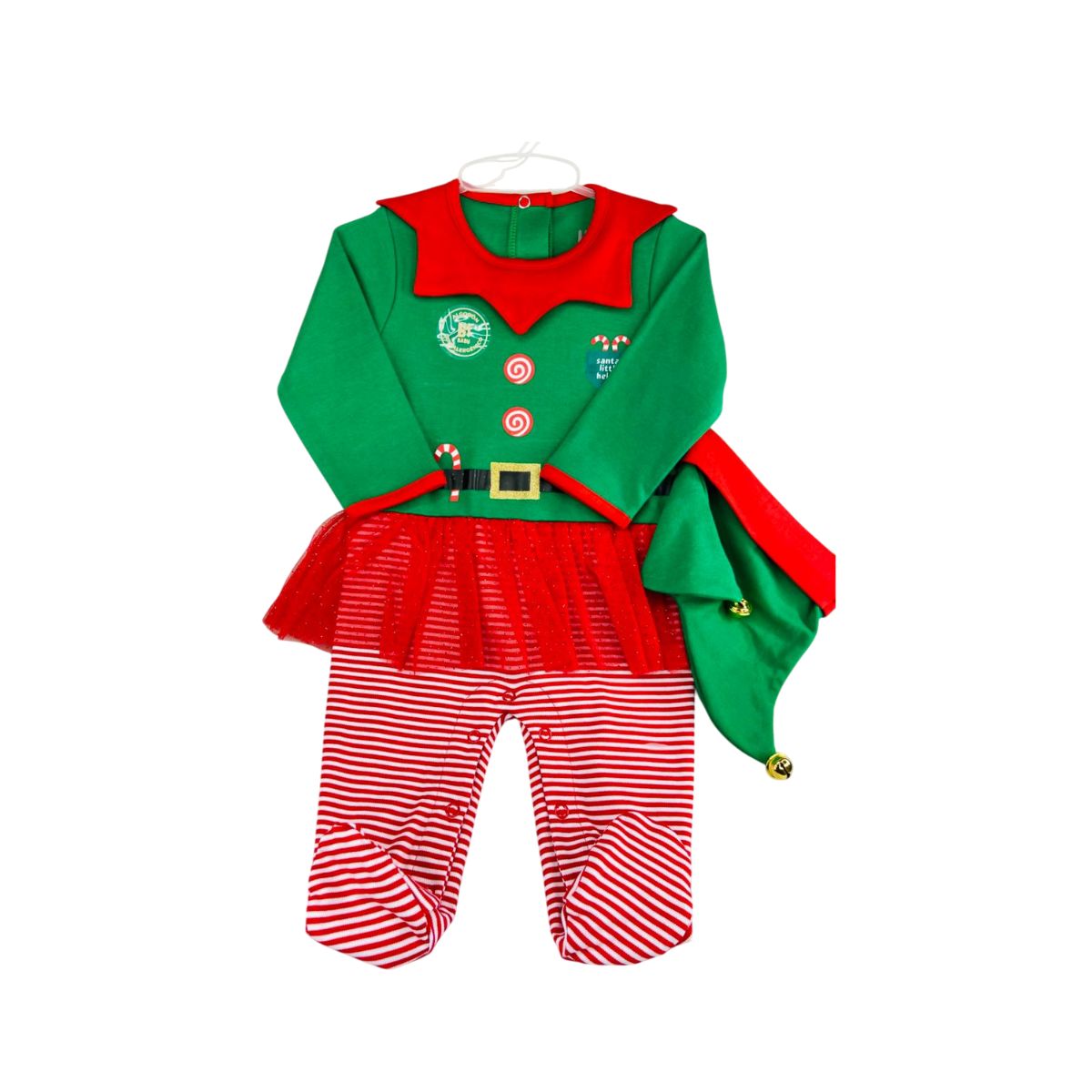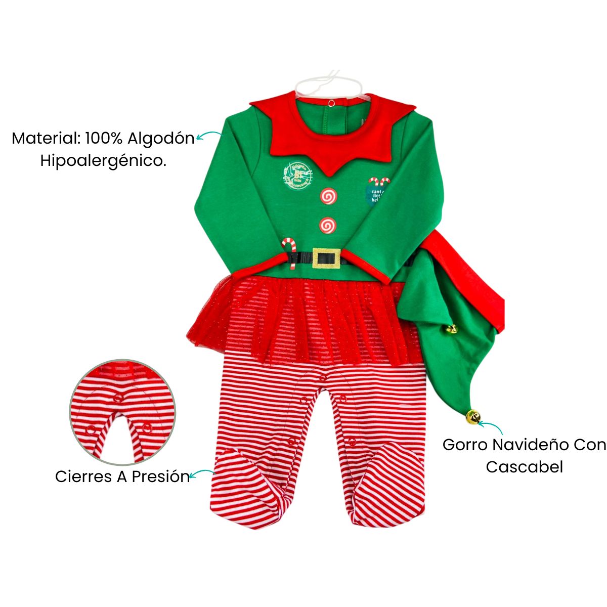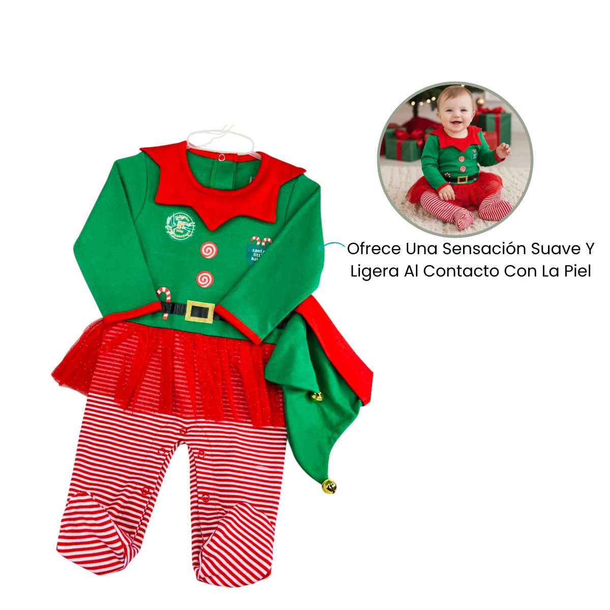 Celebra la temporada más especial del año con este encantador pijama navideño tipo elfa, diseñado para llenar de dulzura y diversión los primeros días de diciembre. Su combinación de colores vivos y su adorable falda de tul hacen que tu bebé brille en cada foto y se convierta en la protagonista de las celebraciones navideñas. Perfecto para sesiones de fotos, reuniones familiares o simplemente para disfrutar de un día festivo en casa.