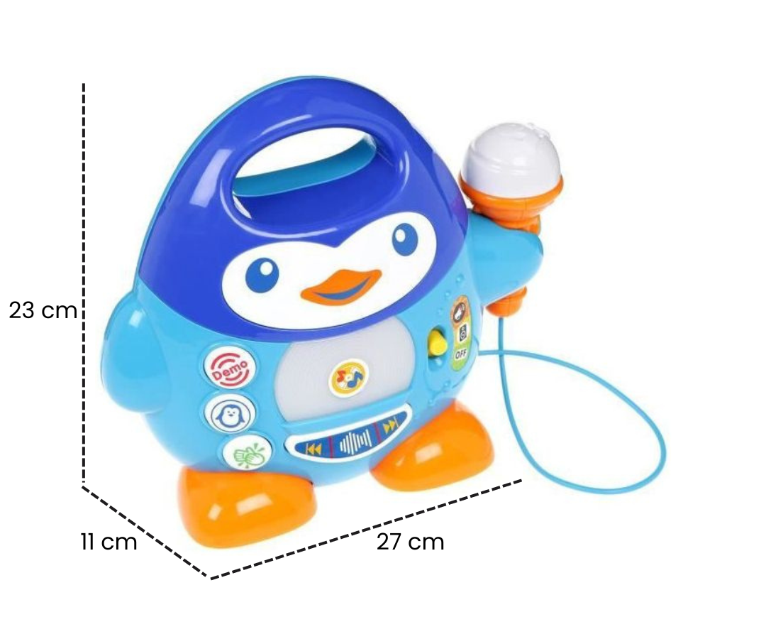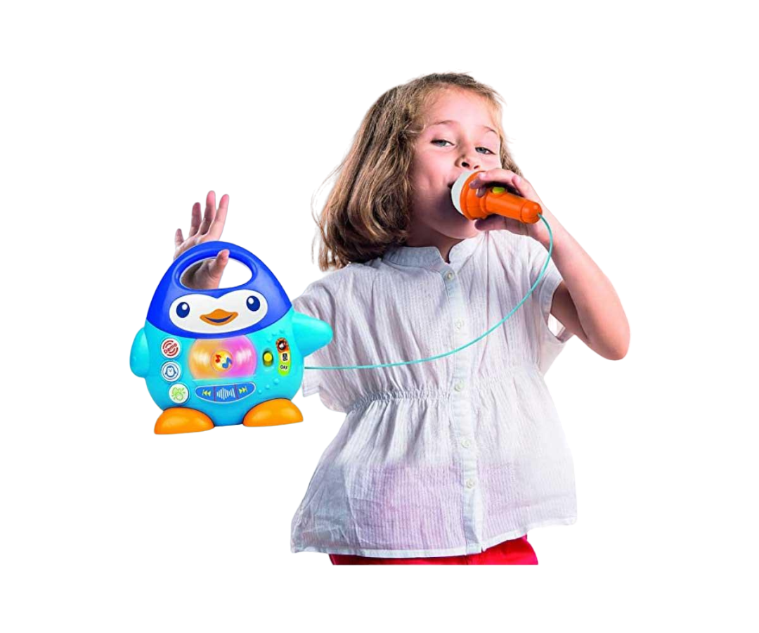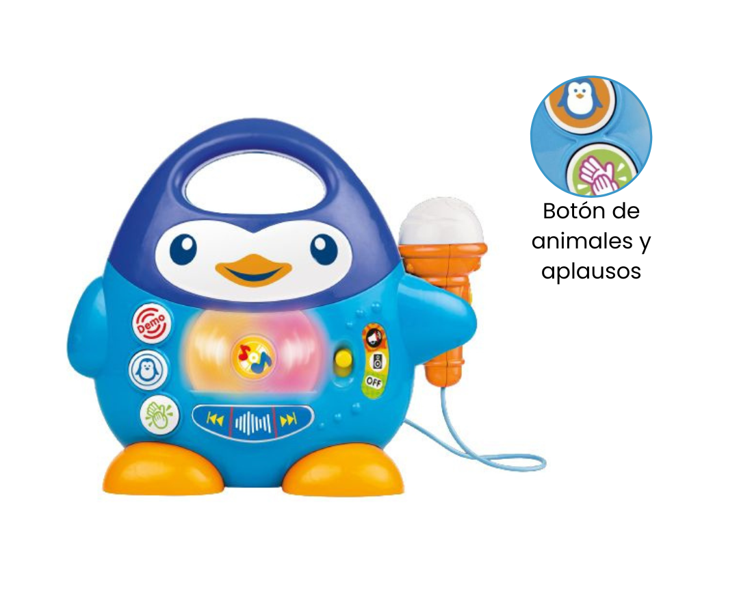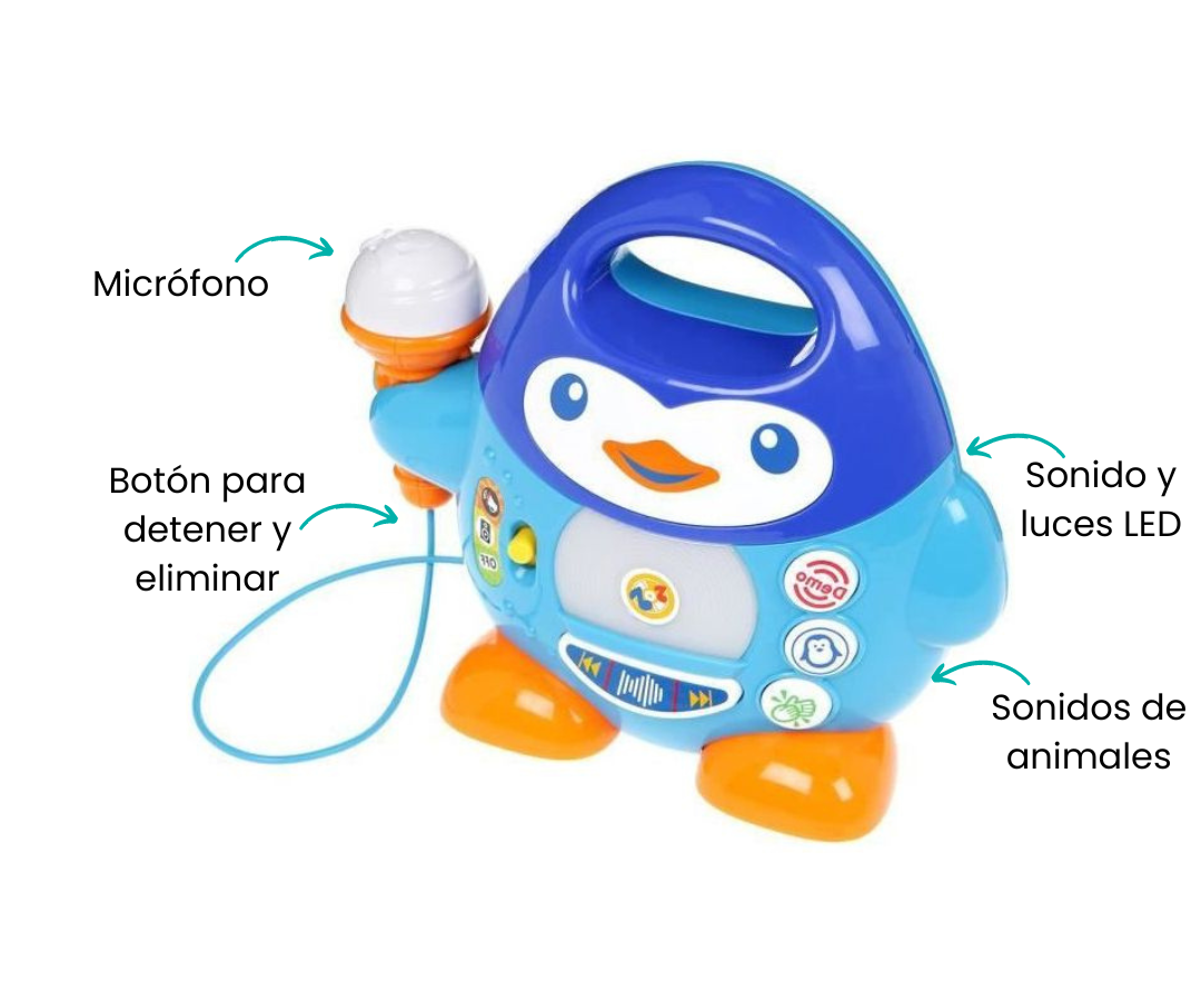 El Pingüino con micrófono es un reproductor de música que proporciona una experiencia lúdica con efectos de sonido y luces LED que parpadean de manera sincronizada con la reproducción musical. Puedes detener la reproducción y eliminar para un control total.