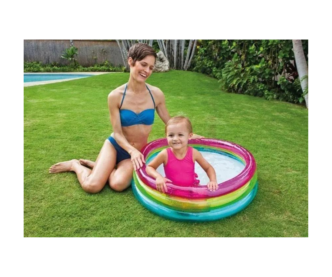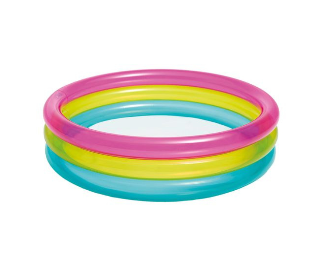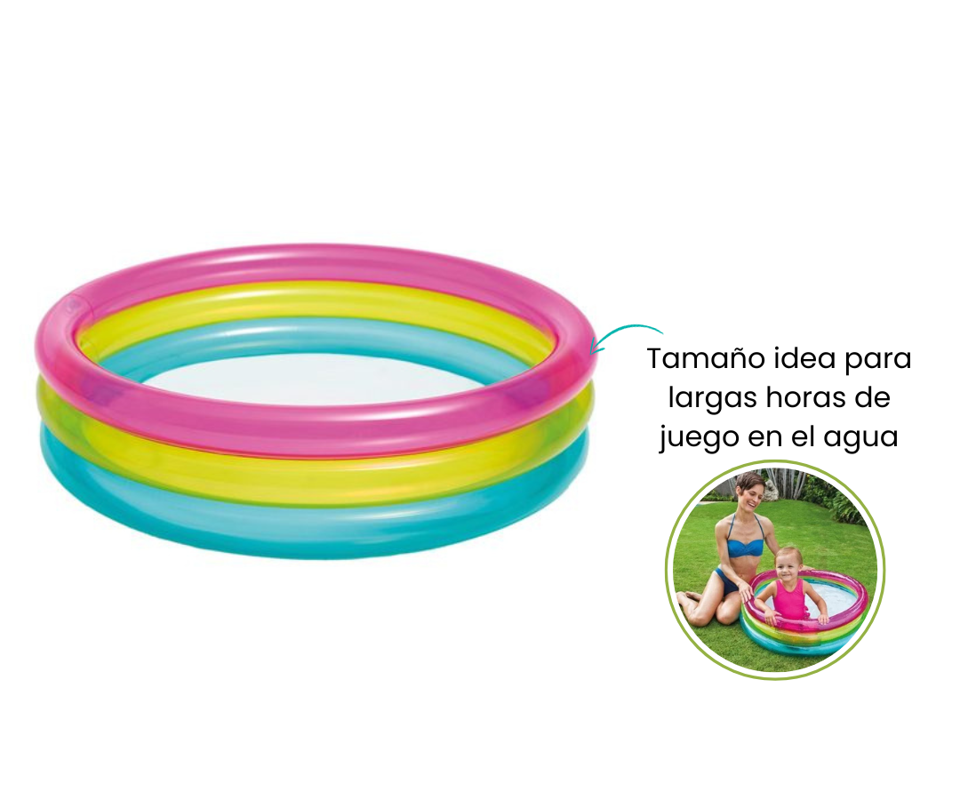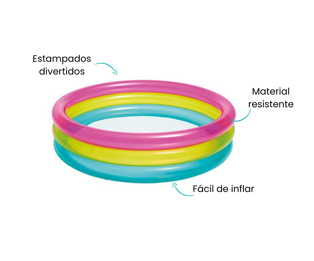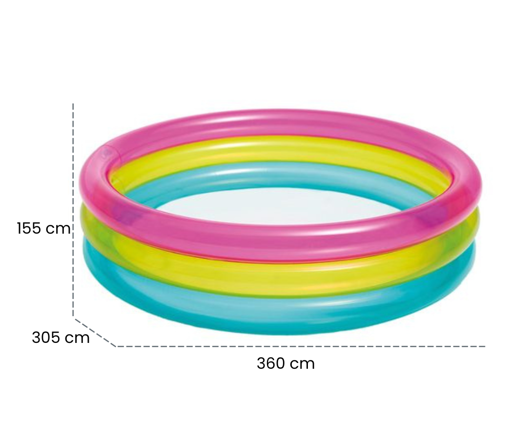 Sumérgete en la alegría de la temporada con nuestra piscina adornada con vibrantes anillos en tonos rosa, amarillo y azul claro.
