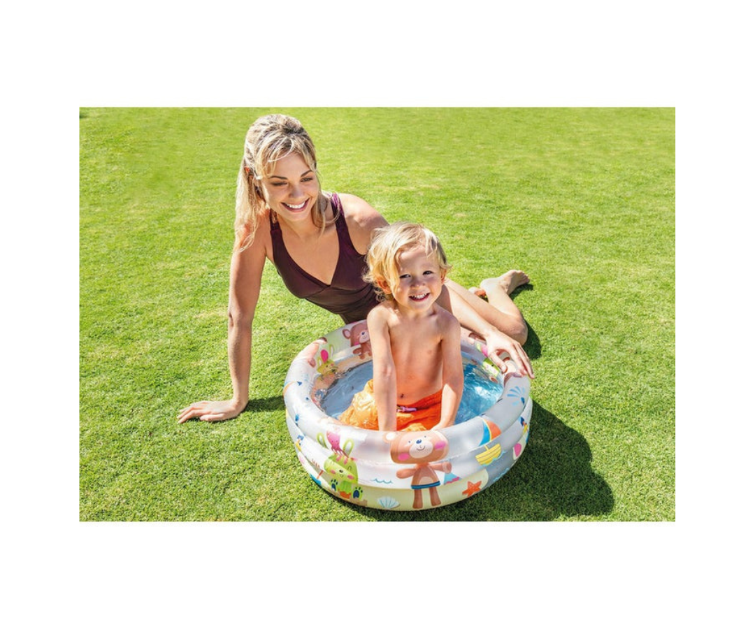 Gracias a su diseño único, la piscina también brindará una protección adecuada al bebé de los rayos del sol. Para una buena ventilación se encuentra un inserto de malla en la pared trasera. Para mayor comodidad, este modelo viene con un fondo inflable para que la caída se produzca sin dolor y el niño pueda sentarse suave y calentito.