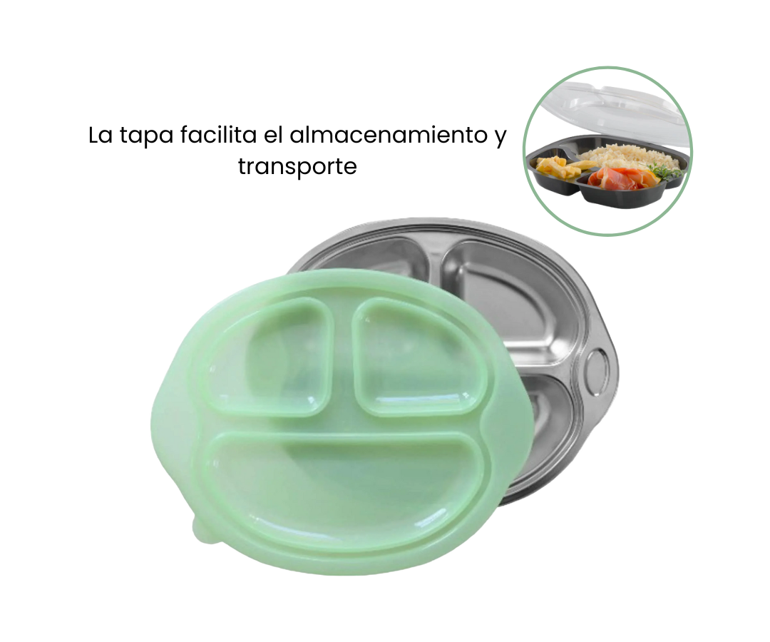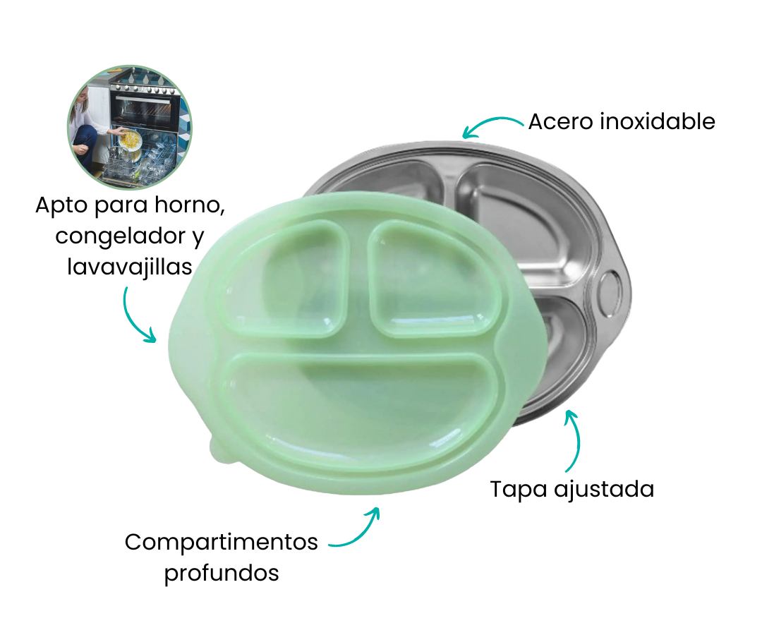 Fabricado con acero inoxidable. Tanto la placa como la tapa son libres de BPA, ftalato, plomo y PVC, garantizando la pureza de los alimentos. Su construcción duradera y resistente significa que no se manchará, oxidará, agrietará ni albergará olores o gérmenes, proporcionando una opción segura y confiable para la alimentación de tu hijo.