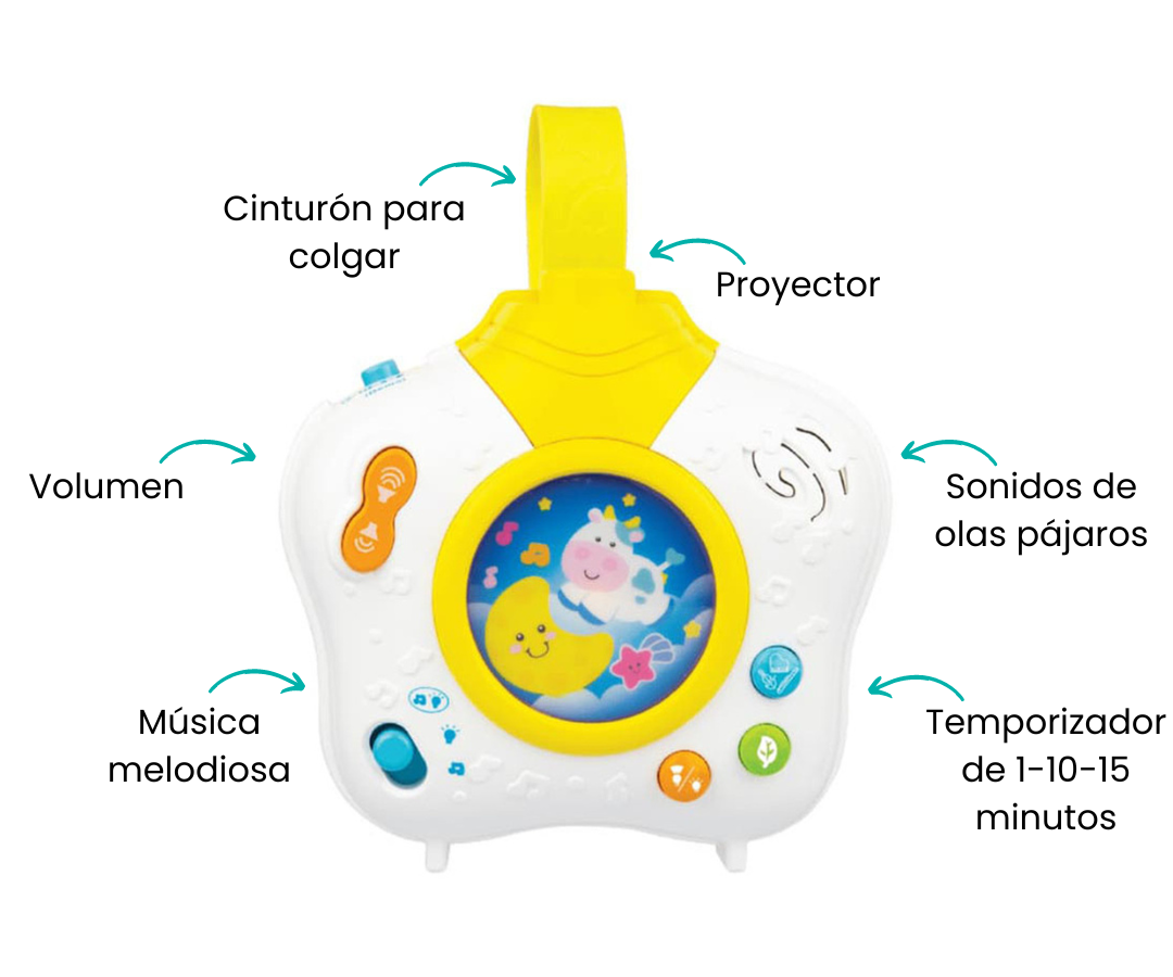 Con la combinación de sonidos e imágenes divertidas que emite la lámpara del proyector, tu bebé pasará maravillosos momentos de relax antes de dormir.