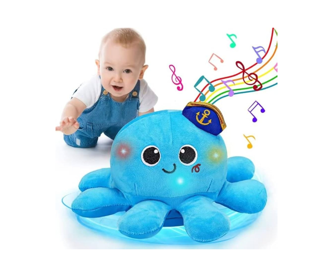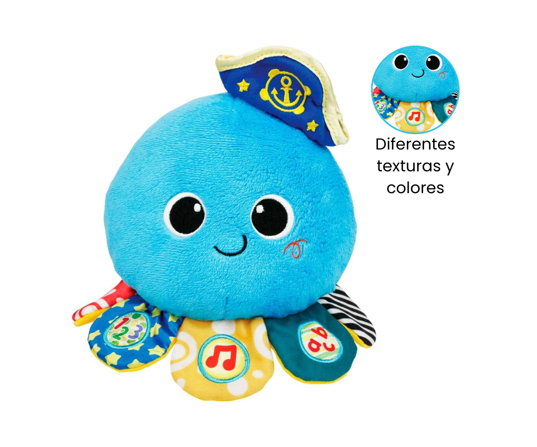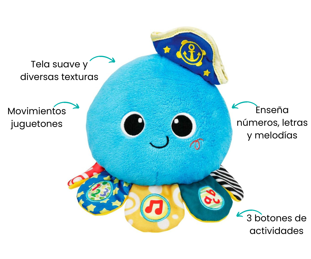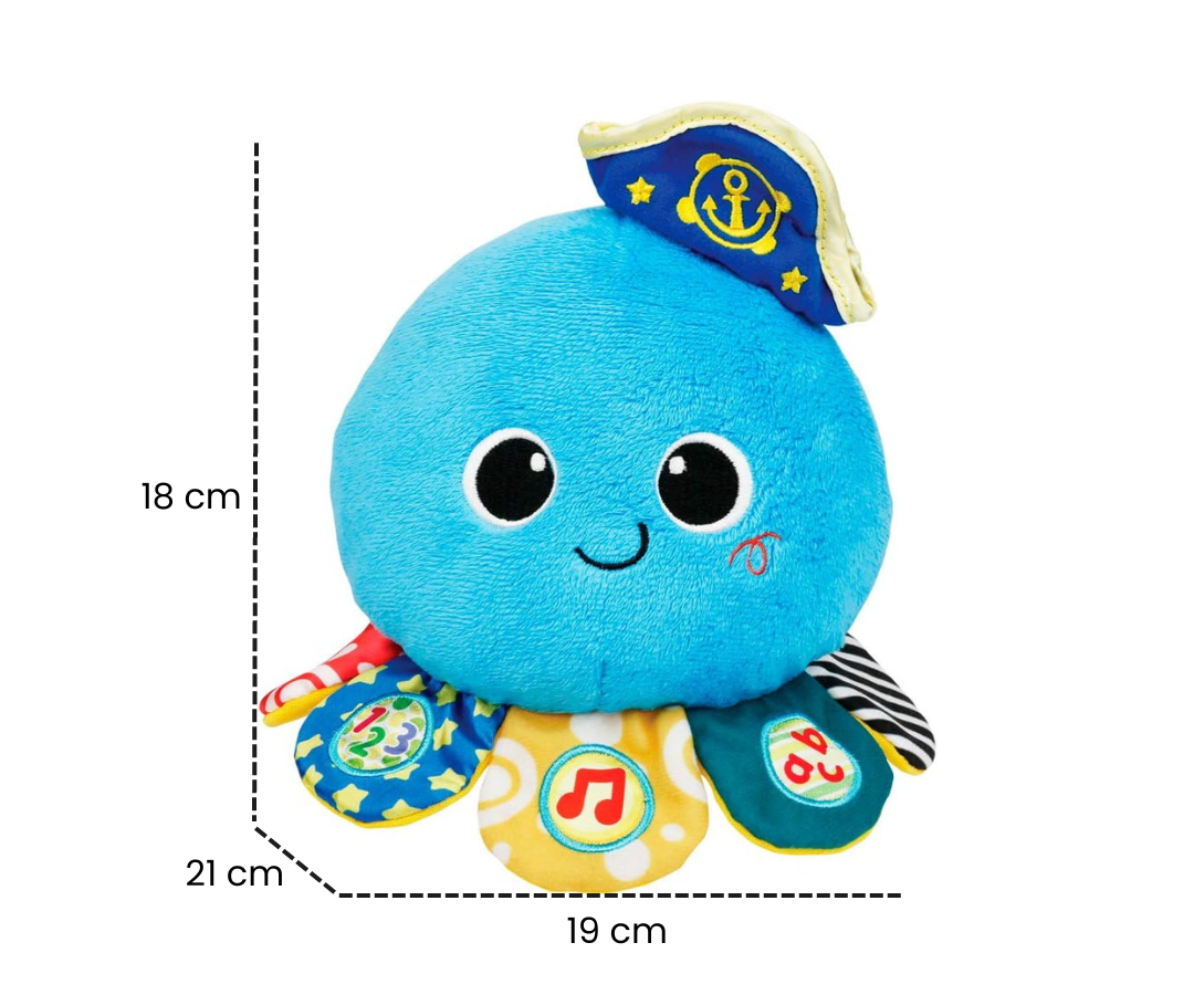Hecho con tela suave y adornado con diferentes texturas y colores en su cuerpo y tentáculos, el pulpito brinda una experiencia táctil y visual. Cuando se pulsa el botón de melodías, el pulpito da movimientos juguetones de un lado a otro y anima a tu pequeño a unirse a la diversión y a bailar.