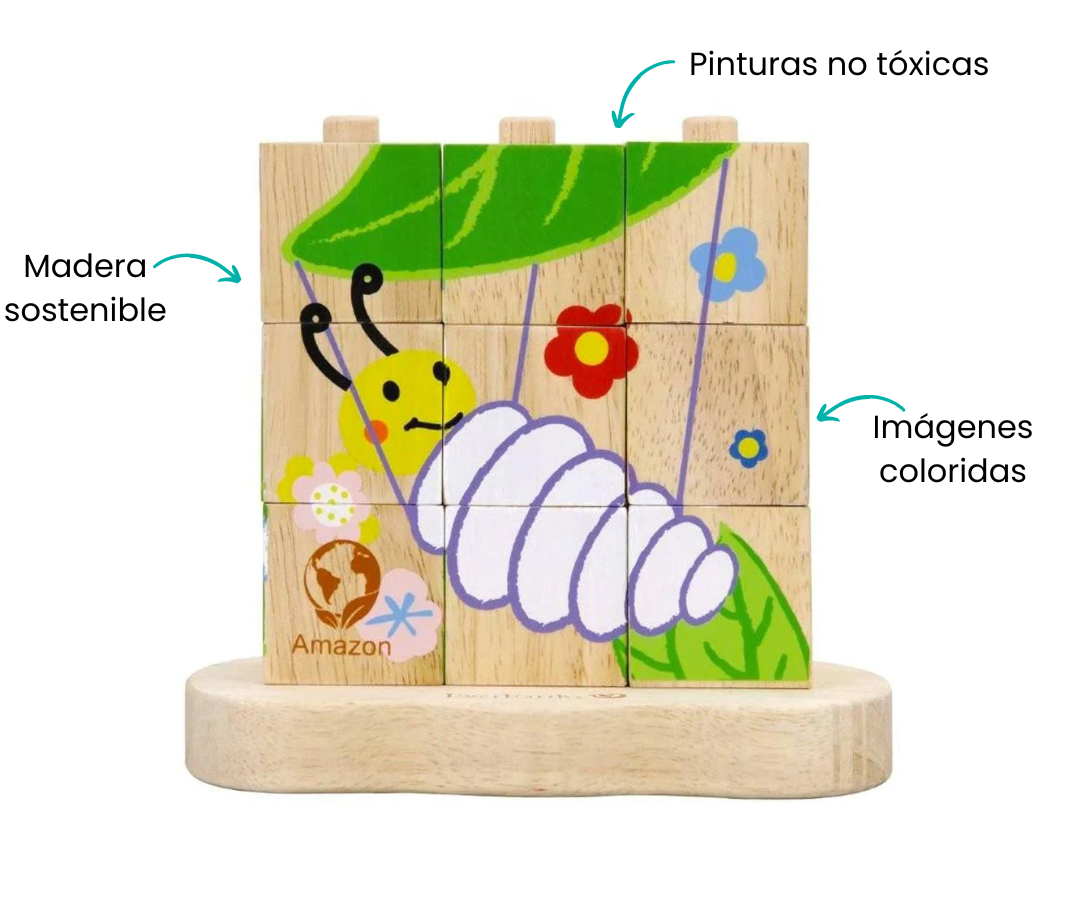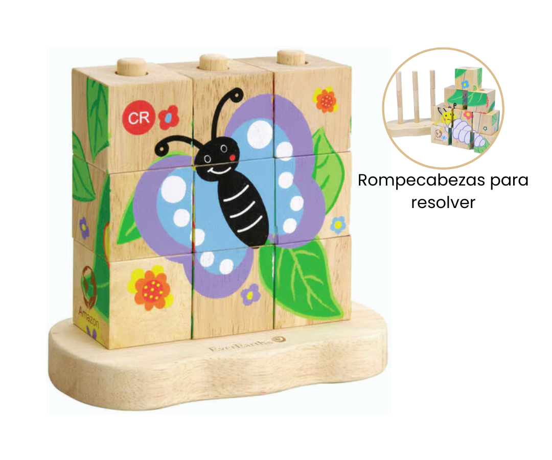 Con imágenes coloridas que muestran el ciclo de vida de una mariposa y un rompecabezas para resolver, este juguete ayudará a tu bebé a recordar lo que ha aprendido y a desarrolla sus habilidades motoras y lógicas.
