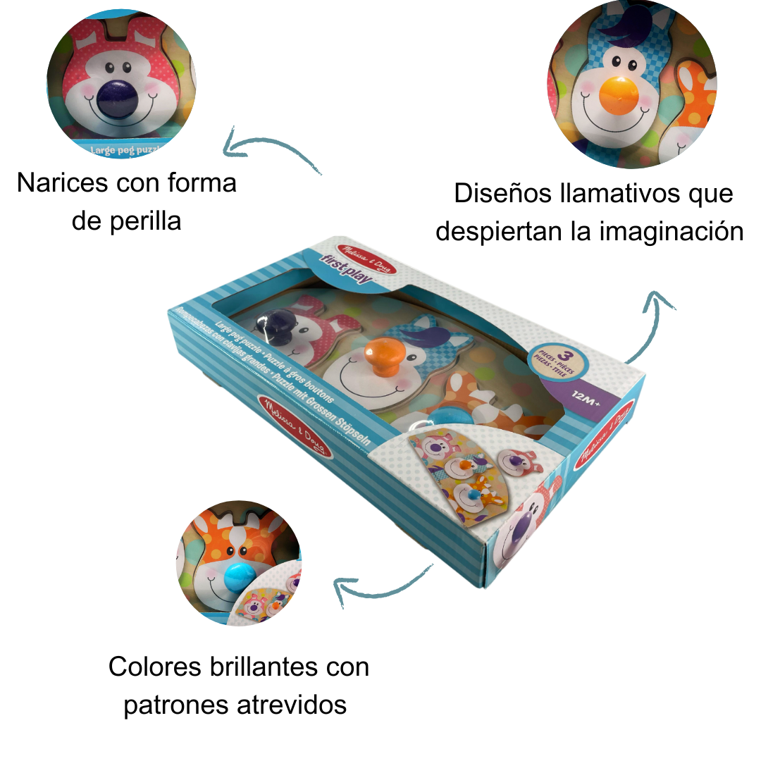 A las pequeñas manos y a las grandes imaginaciones les encantarán estos simpáticos animales de safari de madera con narices enormes. El sonriente tigre, la jirafa y el león tienen protuberancias de madera fáciles de agarrar. Bebés y niños pequeños se divertirán uniendo las piezas con las imágenes en el robusto tablero de rompecabezas de madera