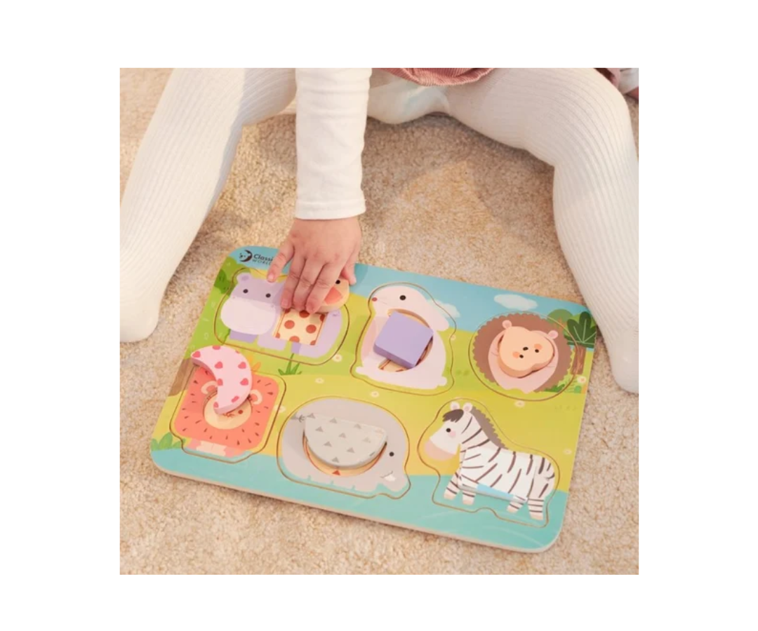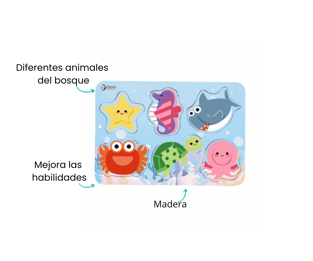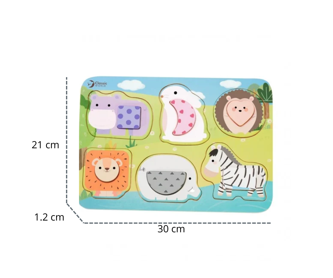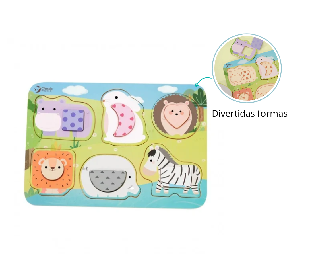 El juguete consiste en un tablero con 6 bloques de colores con animales y una base de madera. Cada bloque tiene una parte de la imagen de un animal. El objetivo es colocar los bloques en la base de madera de manera que formen la imagen completa. Los huecos en la base corresponden a la forma de los bloques. Este juego ayuda al niño a desarrollar la coordinación mano-ojo y la resolución de problemas visuales.