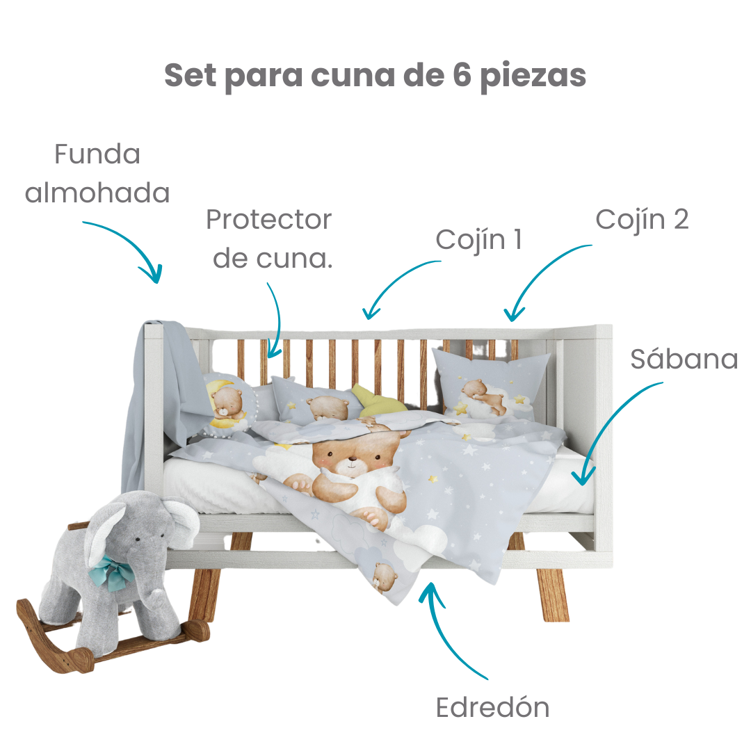 Set para decorar la cuna de tu bebé, incluye edredón, sábana, 2 almohadas, faldón y bumper.