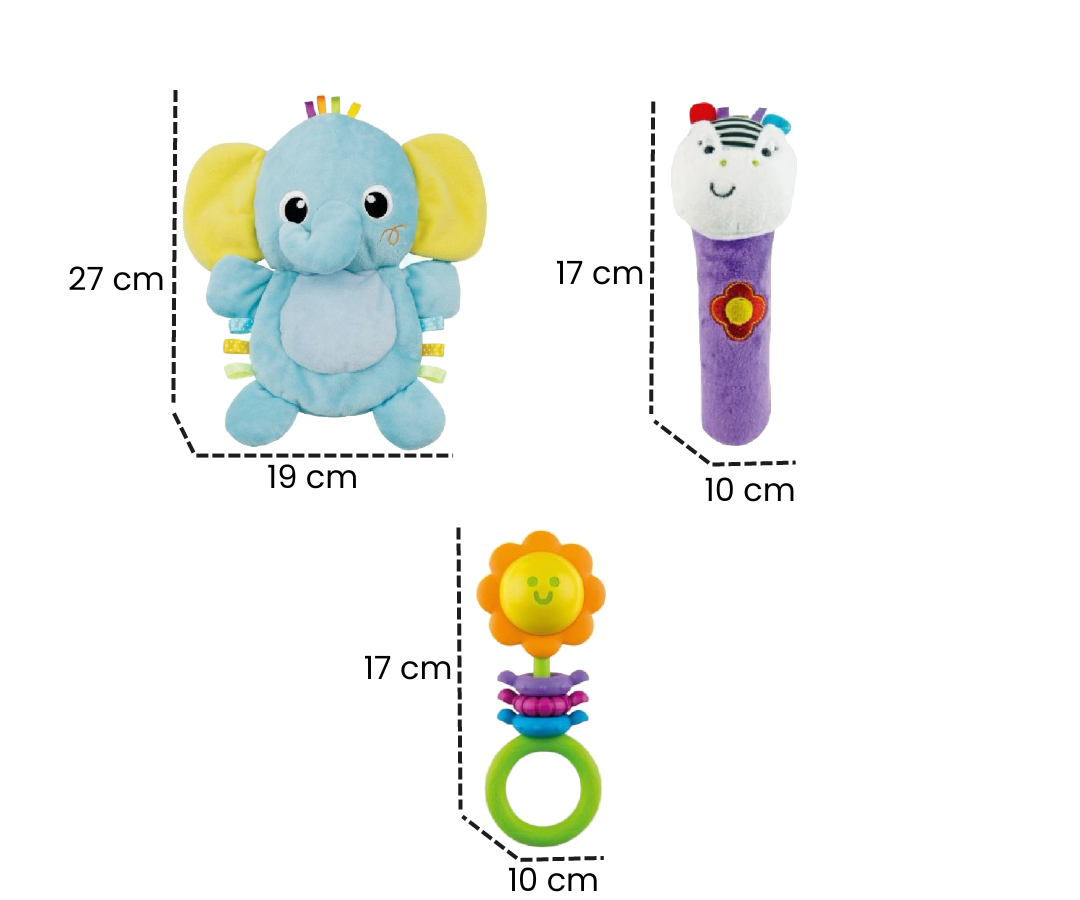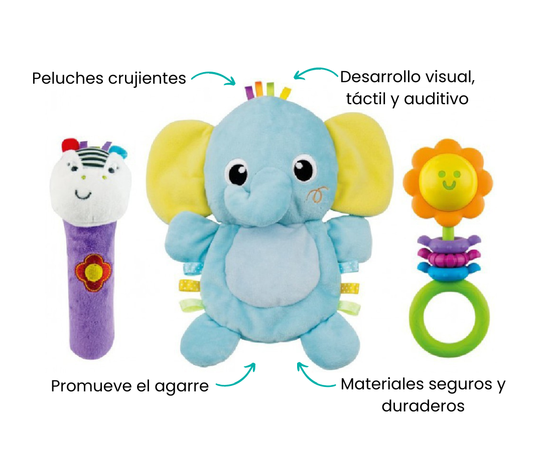 Descubre la diversión y el aprendizaje con el Juego de 3 juguetes de animales de peluche crujientes. Diseñados no solo para mantener a tu bebé jugando felizmente, sino también para fomentar el desarrollo de sus sentidos y habilidades motoras.