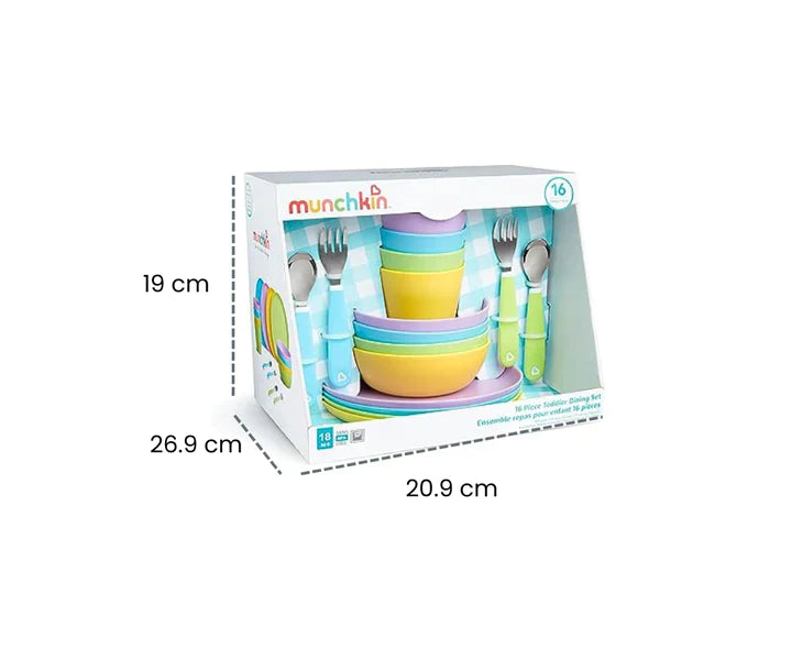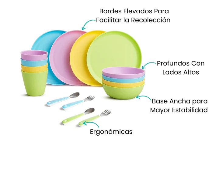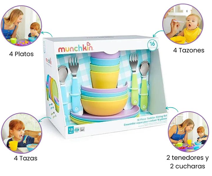 Es hora de estar preparados para la transición de biberones a alimentos sólidos y la emocionante etapa de la autoalimentación. En Munchkin, sabemos lo importante que es esta fase de desarrollo, por eso te presentamos el juego de comedor de 16 piezas, una colección vibrante y resistente de vajilla infantil diseñada para hacer que la hora de comer sea aún más especial.
