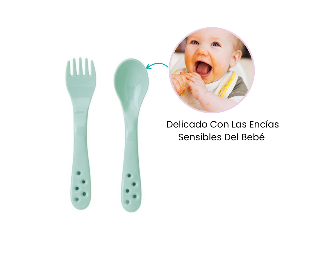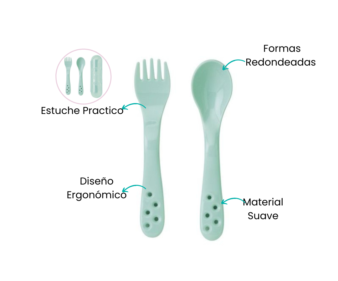 Estos dos cubiertos ergonómicos están diseñados para adaptarse perfectamente a la mano del bebé, proporcionando un agarre cómodo y seguro durante la alimentación. Son perfectos para llevarlos de viaje o en salidas fuera de casa.