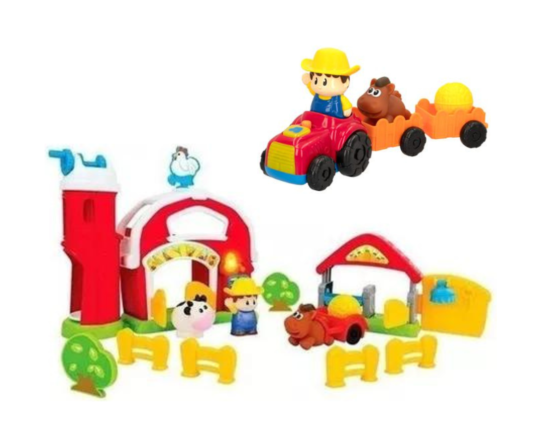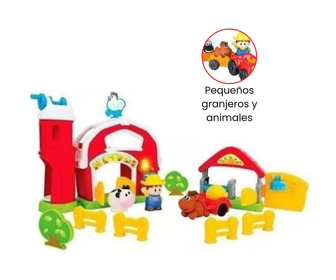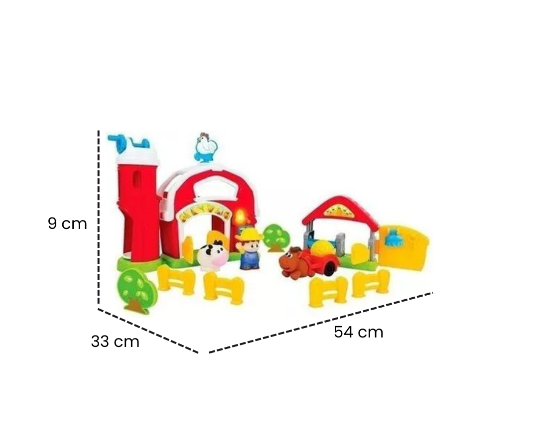 Amanece en la granja con el canto del gallo. Los pequeños granjeros de la casa tendrán que cuidar de los animales y recoger el trigo, molerlo en el molino y transportarlo en carretilla con la ayuda de un caballo, una vaca y el gallo. El granjero pulsa la campanita que hay junto a la puerta, ésta se iluminará y se escucharán diferentes melodías y sonidos de animales.