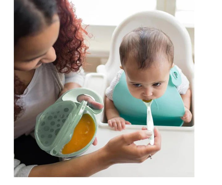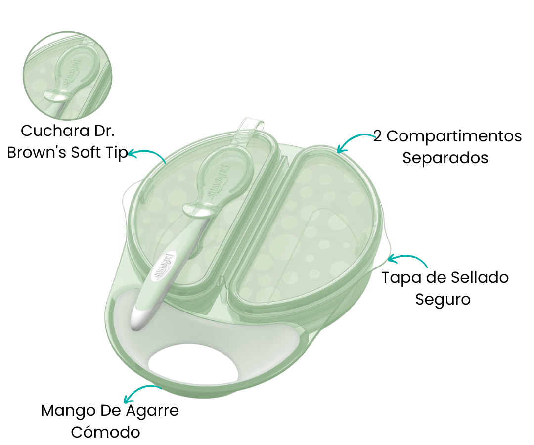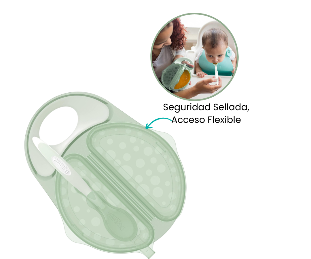 Prepárate para alimentar a tu bebé sin preocuparte por ensuciar. Diseñado para la movilidad, este conjunto cuenta con dos compartimentos separados ideales para llevar diferentes alimentos. La tapa de sellado seguro garantiza que los alimentos se mantengan almacenados de manera segura, y su diseño flexible te permite acceder a un compartimento a la vez o quitar la tapa por completo.