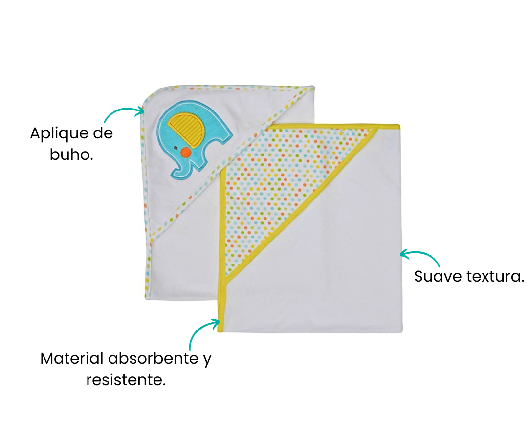 Convierte el baño en un momento de mimos y calidez. La absorbente toalla para bebé, con su simpático aplique de elefante, envuelve delicadamente al pequeño, brindándole protección contra el frío y las corrientes de aire.