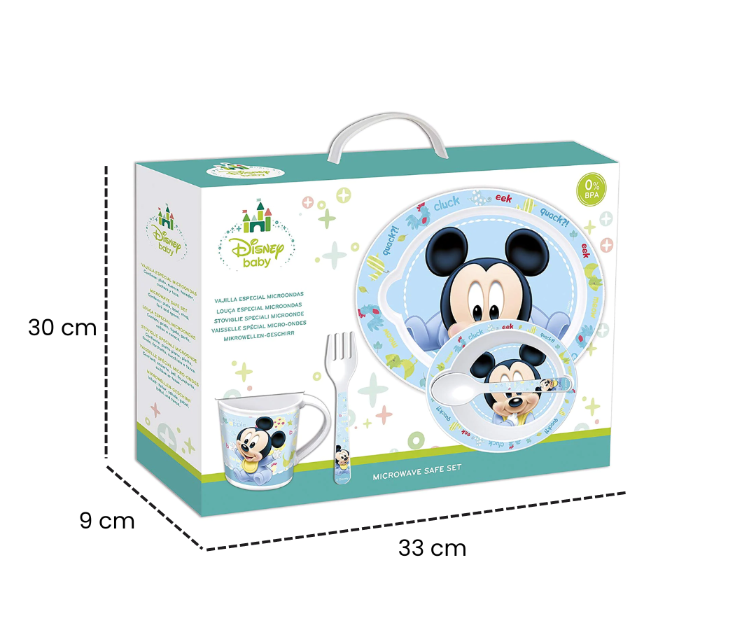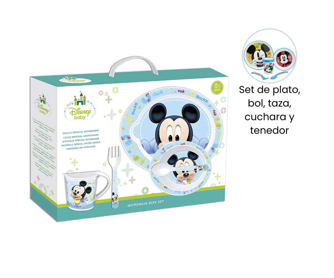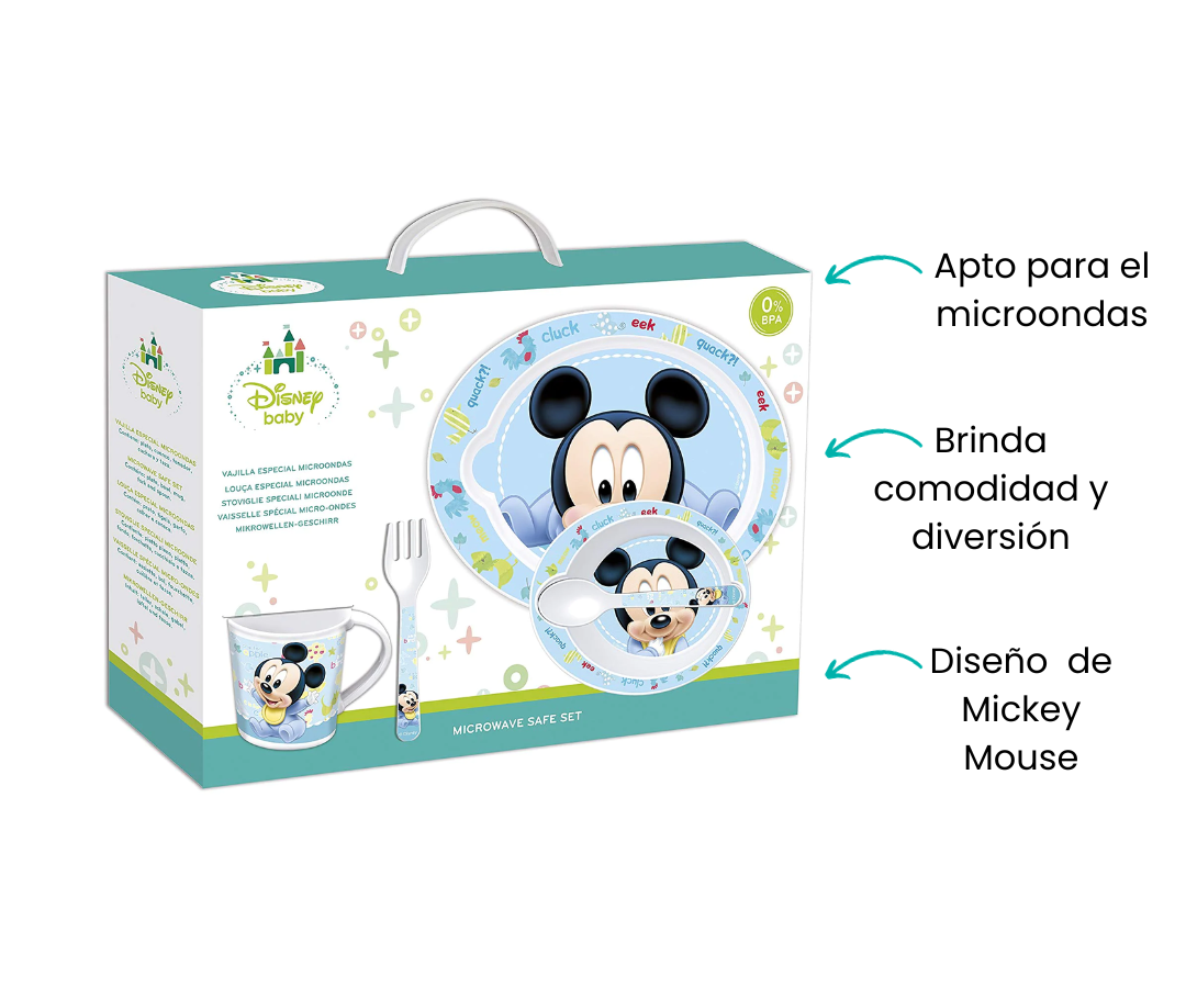 El conjunto incluye un plato, bol, taza, cuchara y tenedor, todo ello adornado con Mickey Mouse. Cada pieza ha sido cuidadosamente seleccionada para brindar funcionalidad en tu día a día.