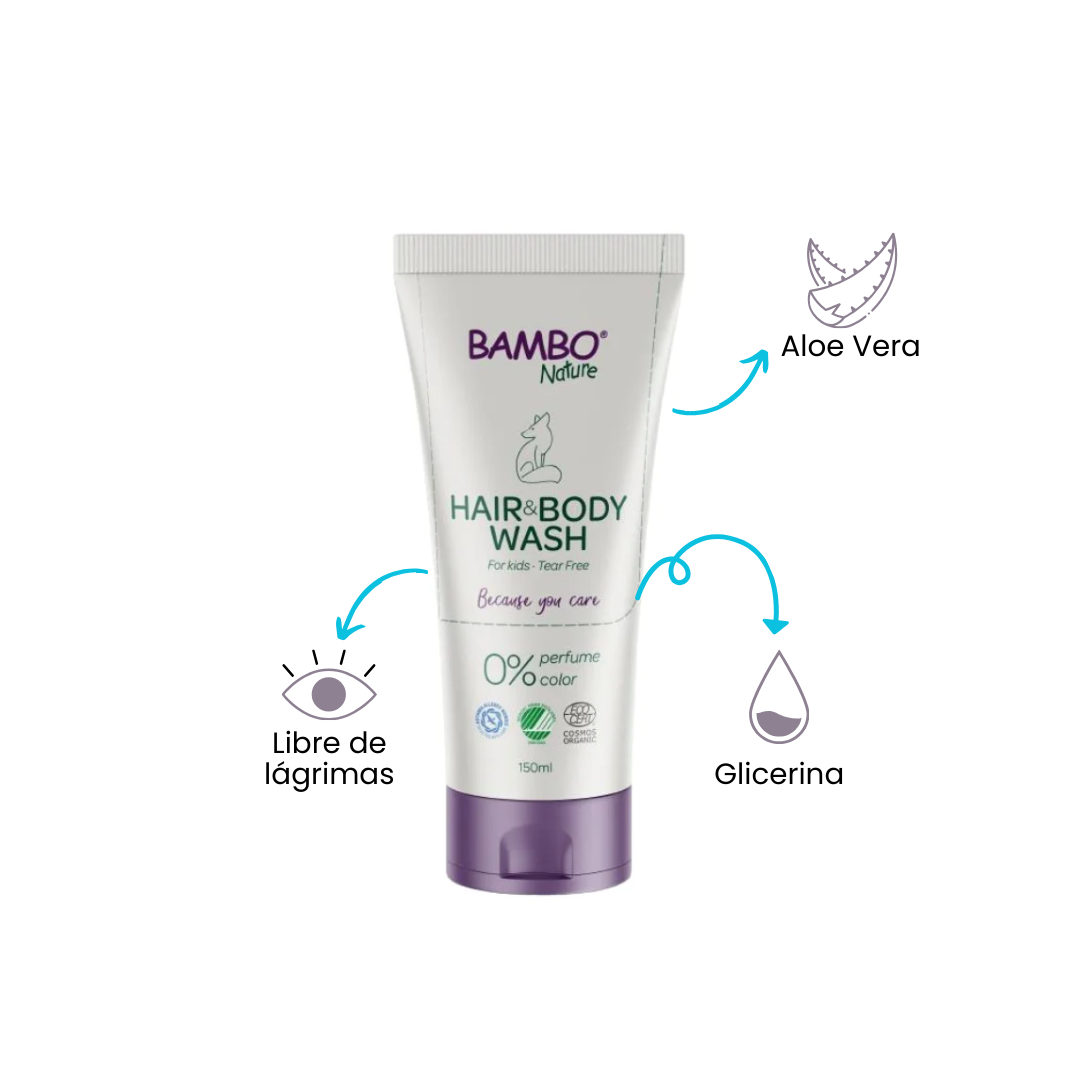 Hair & Body Wash de Bambo tiene una fórmula libre de perfumes, parabenos y colorantes. Dermatológicamente probada.