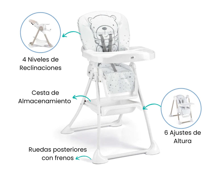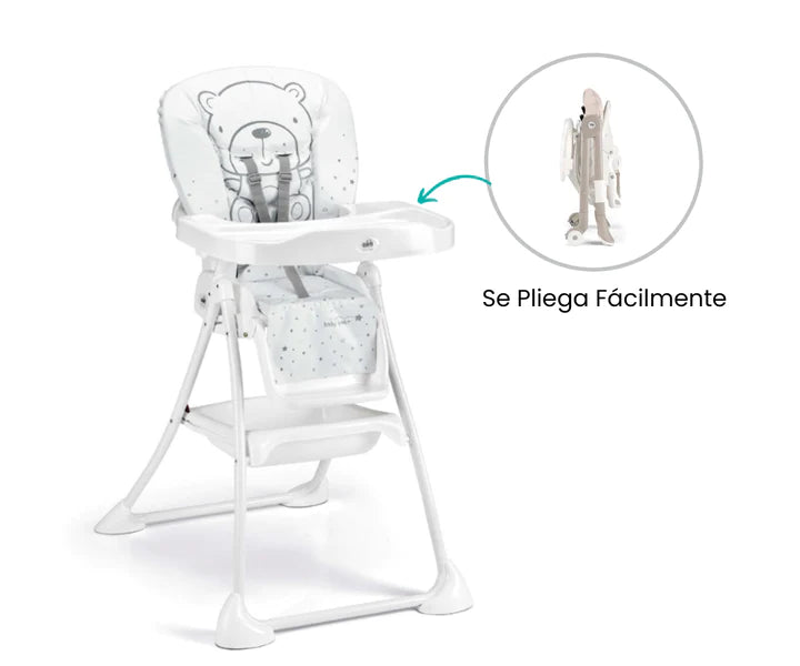 La silla de comer se pliega fácilmente, lo que la convierte en un compañero versátil para tu rutina diaria. Puedes guardarla cómodamente cuando no la necesites o llevarla contigo a casa de los abuelos o a un picnic en el parque.