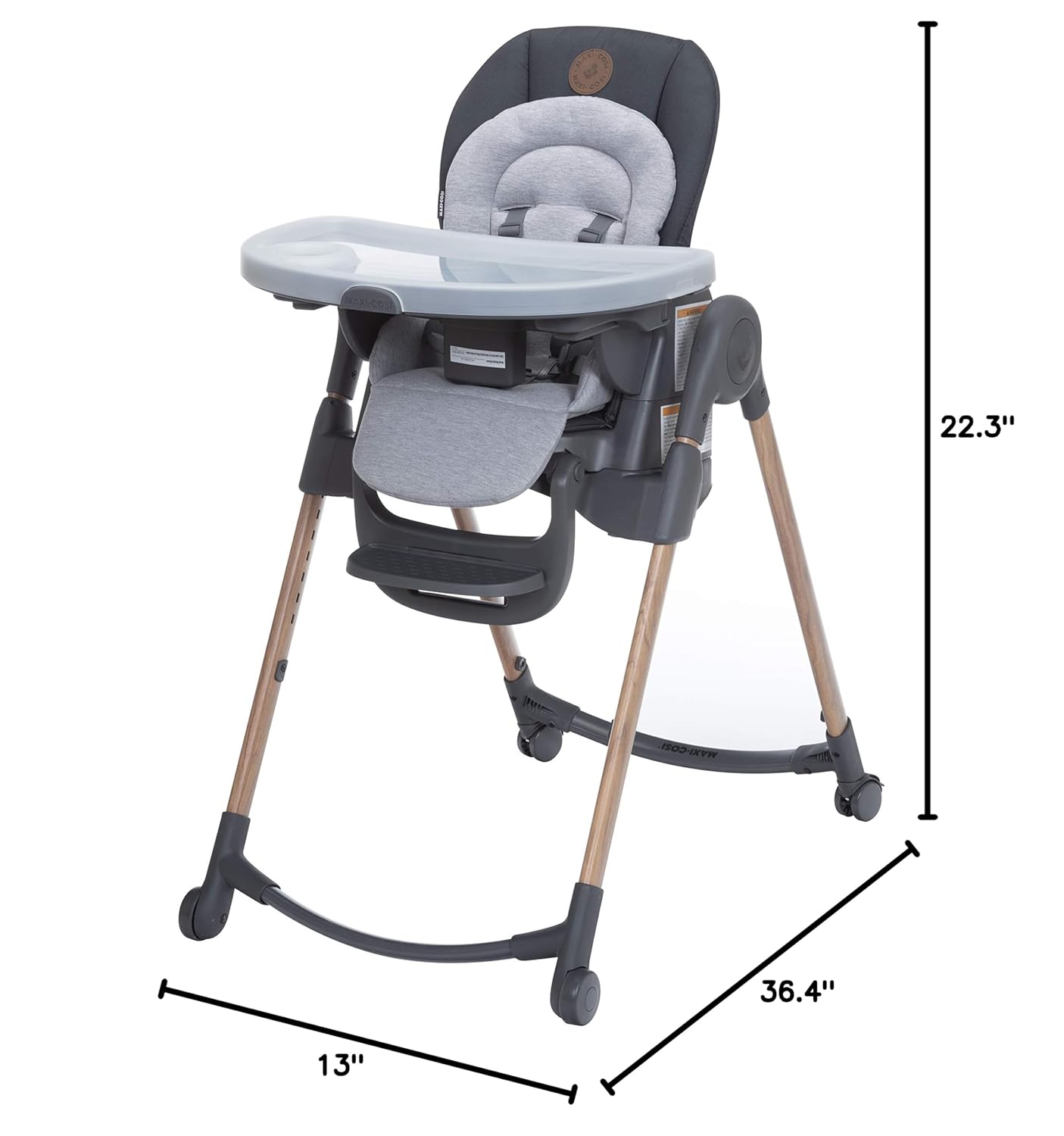 9 posiciones de altura y 5 posiciones de reclinación, más 4 posiciones de bandeja, permiten que Minla pase de un asiento relajado para bebés, a una silla alta convertible, un elevador para niños grandes y luego un taburete infantil a medida que tu pequeño crece.