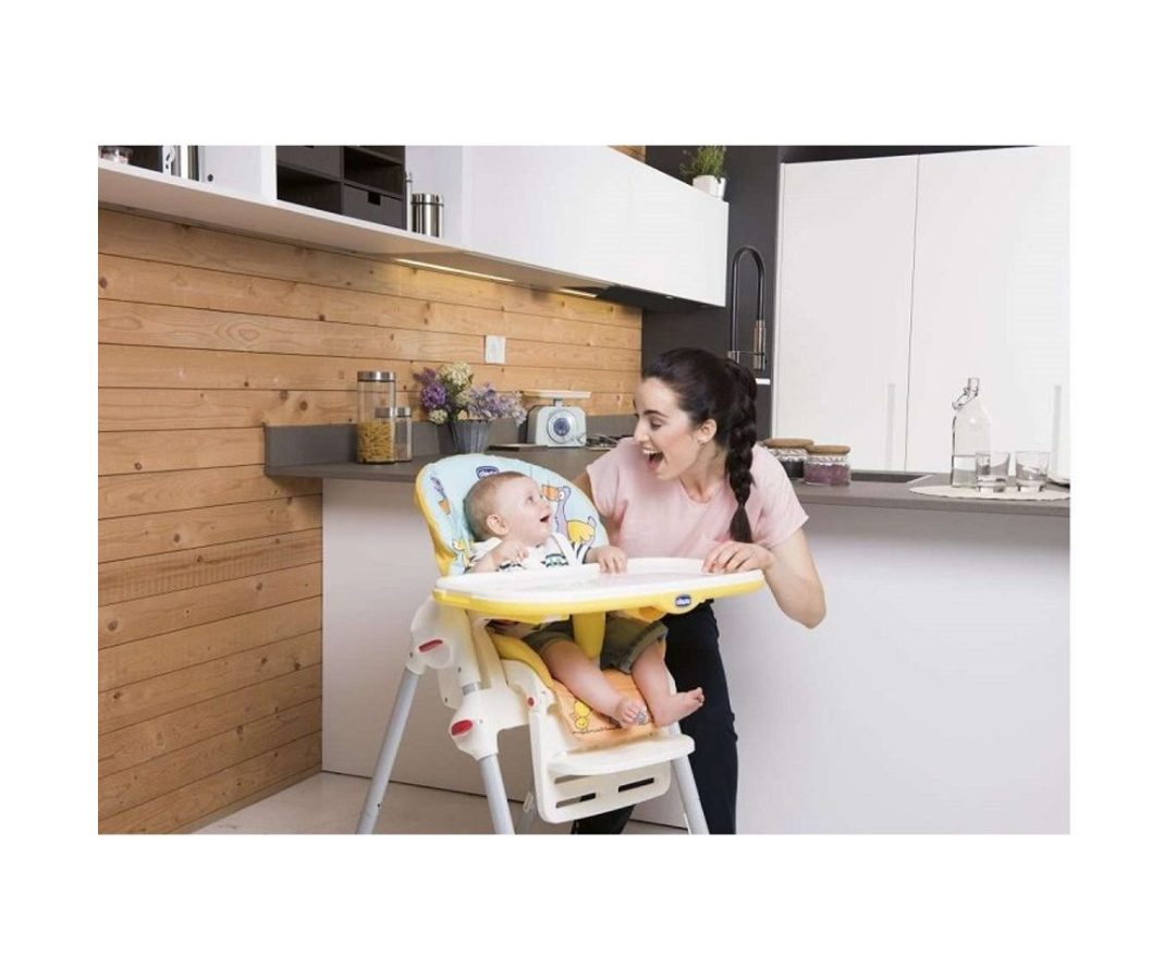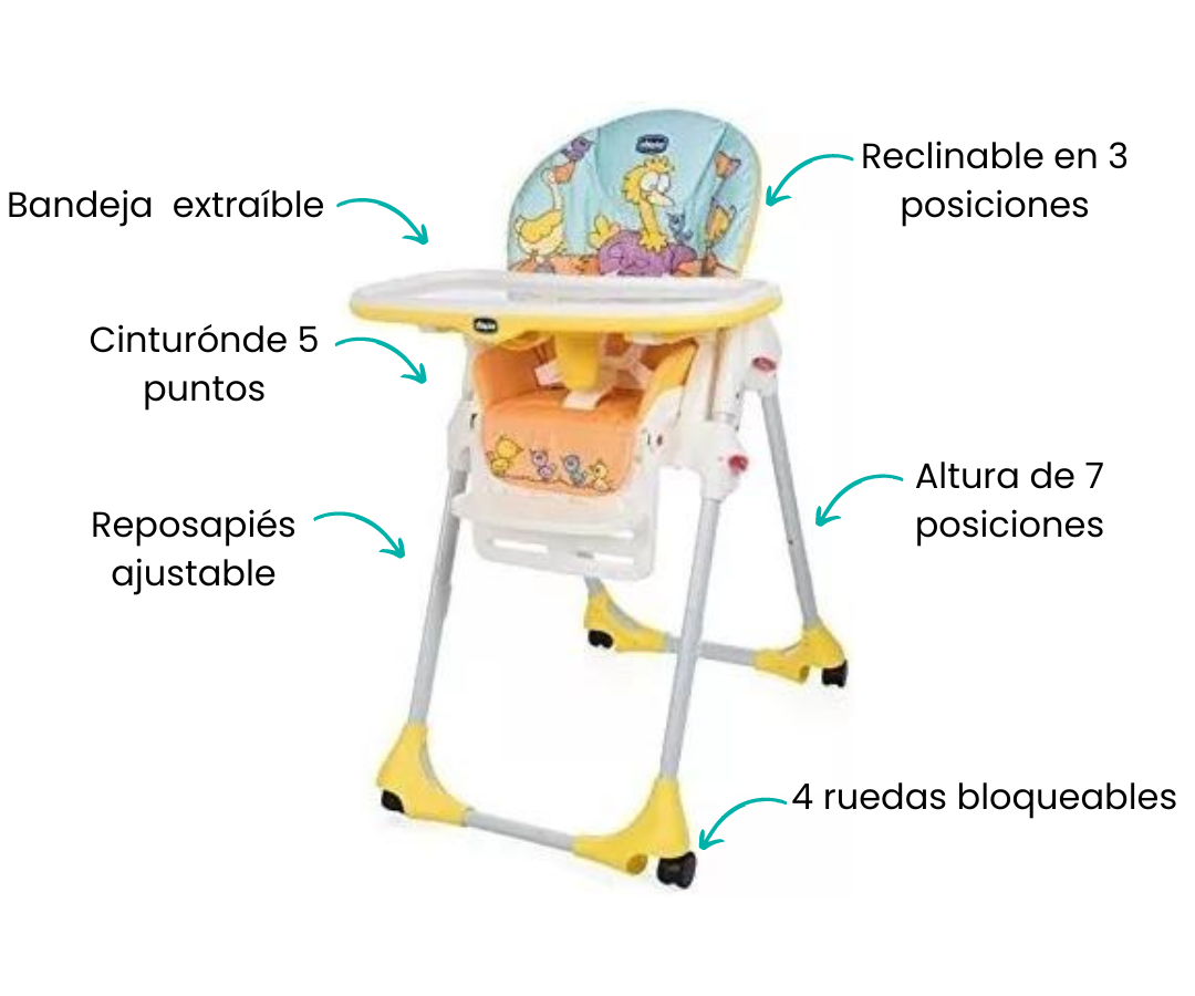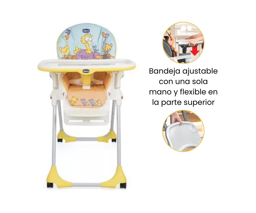 Se destaca por ser compacta una vez plegada, facilitando su almacenamiento. Además, su bandeja para la hora de comer es ajustable con una sola mano y flexible en la parte superior, es fácil de limpiar y puede acoplarse a las patas traseras cuando no está en uso.